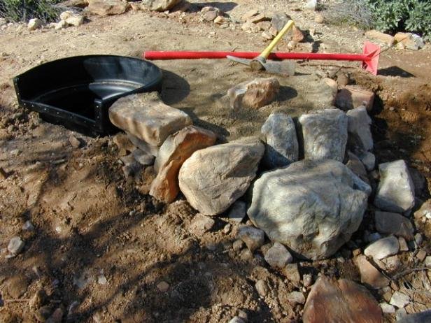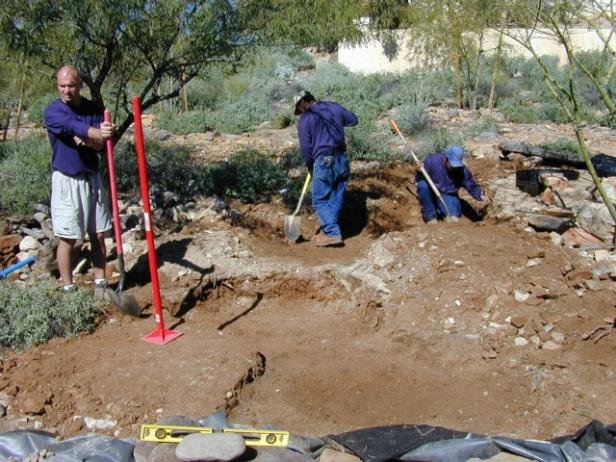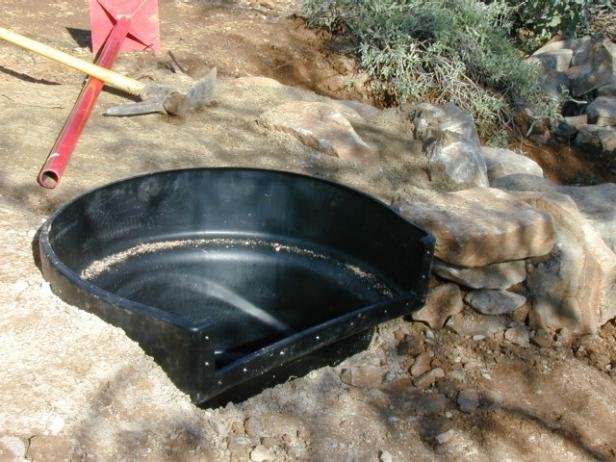 - Когда вы определили местоположение будущего пруда и приобрели форму, необходимо создать котлован по размерам формы. Сначала форму укладывают верхней частью на землю, а затем отмечают её контур при помощи колышков. Котлован важно вырыть на 15 см больше по ширине и глубине.