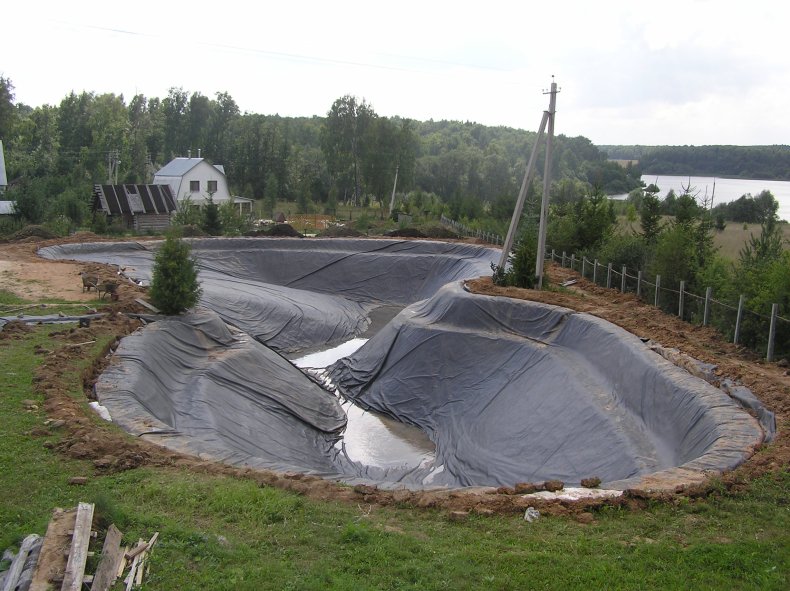 Для обустройства подойдет пвх-пленка или бутилкаучуковая, первая служит примерно 10 лет, а вторая около 50. Создается пруд таким образом: