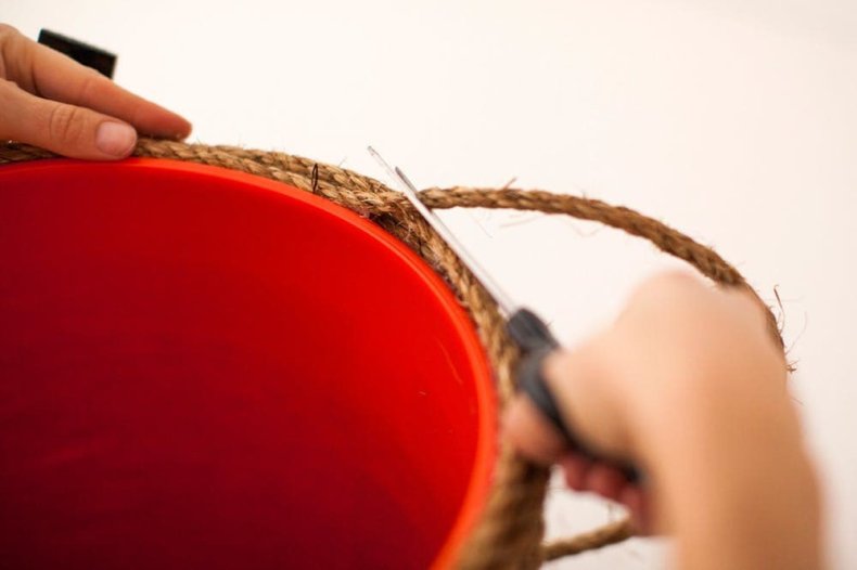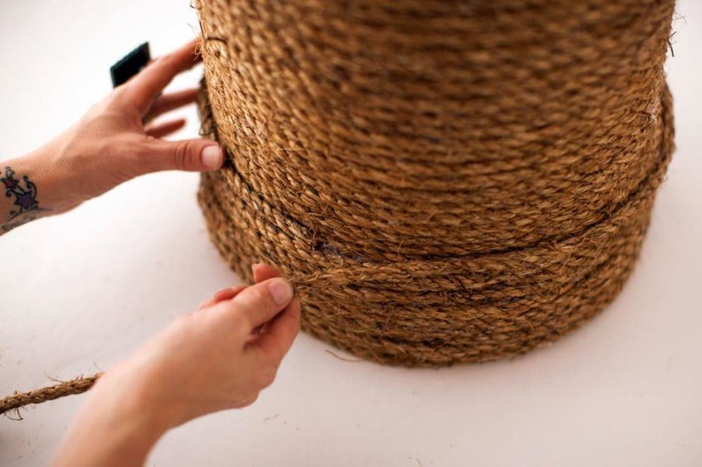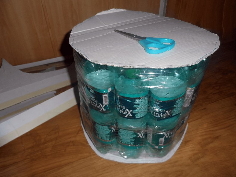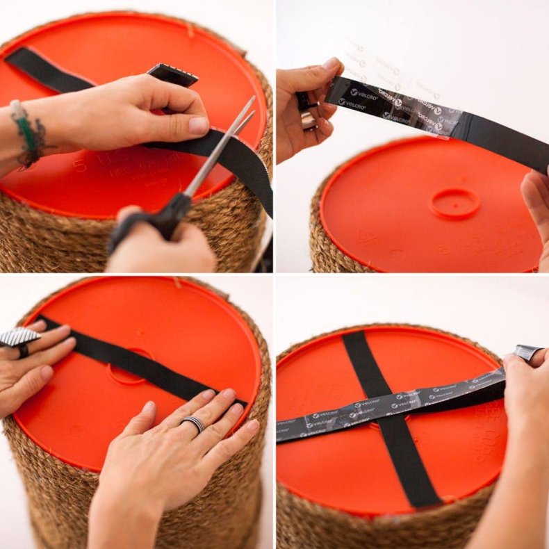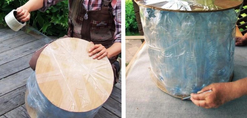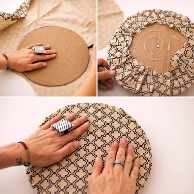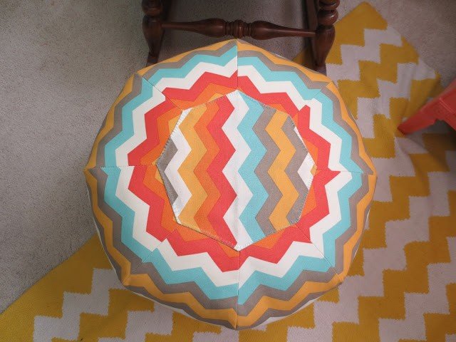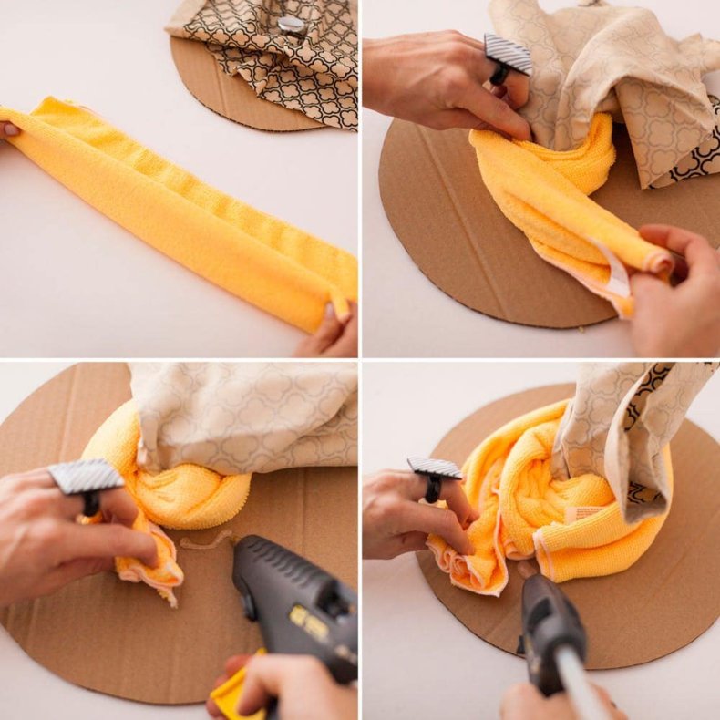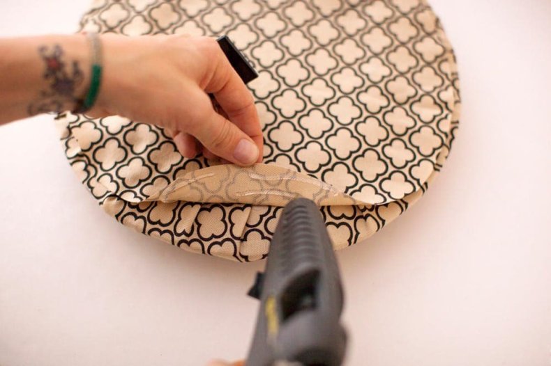 - Приклеить с помощью клеевого пистолета сидение к основе пуфика.