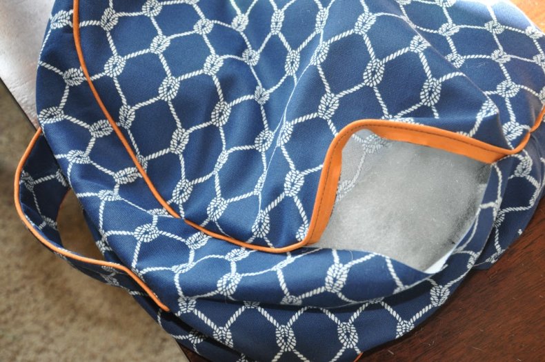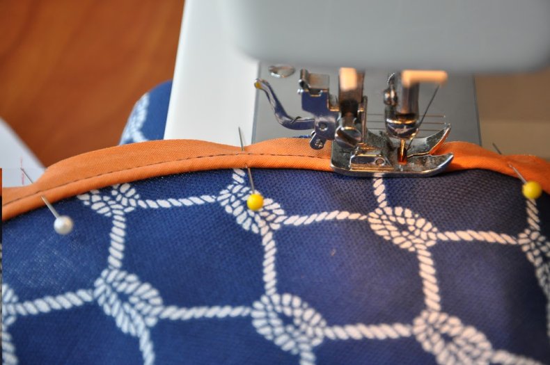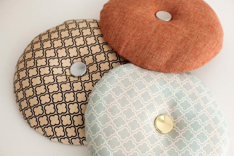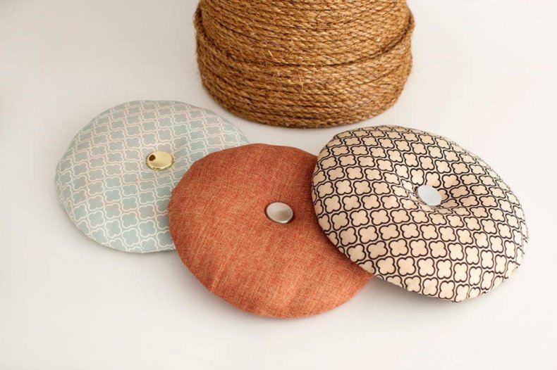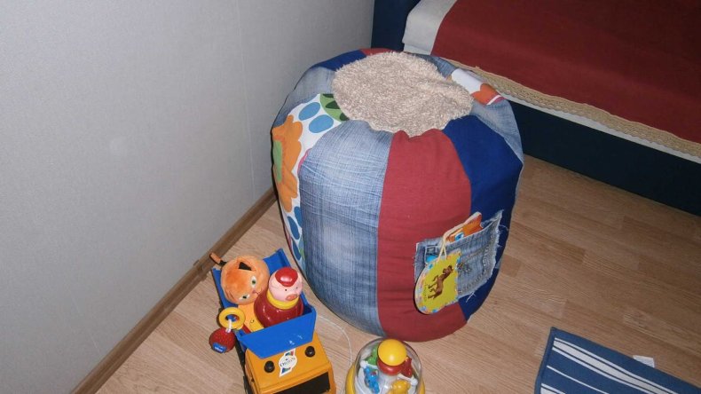 - Далее необходимо сшить чехол для будущего сидения. Если есть швейная машинка, то это значительно облегчит задачу. Если же нет, то его можно сшить вручную. Затем наполнить чехол наполнителем.