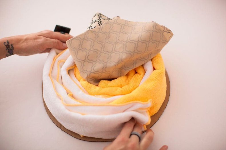 - Следующий этап – это чехол для сидения. Материал может быть любым: вязаное полотно, меховое, хлопковая плотная ткань, мешковина. Из ткани сшить заготовку и наполнить ее наполнителем.
