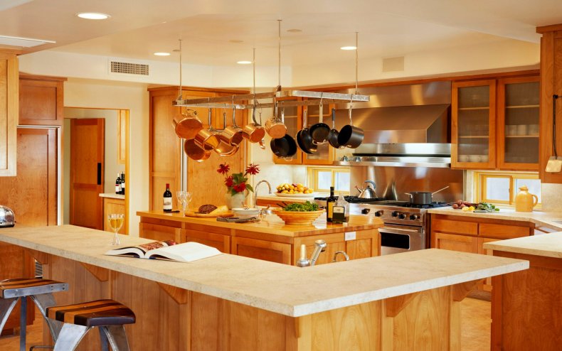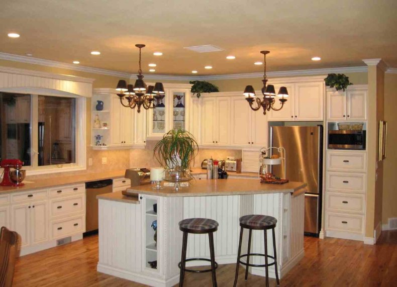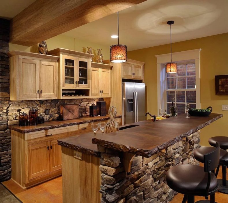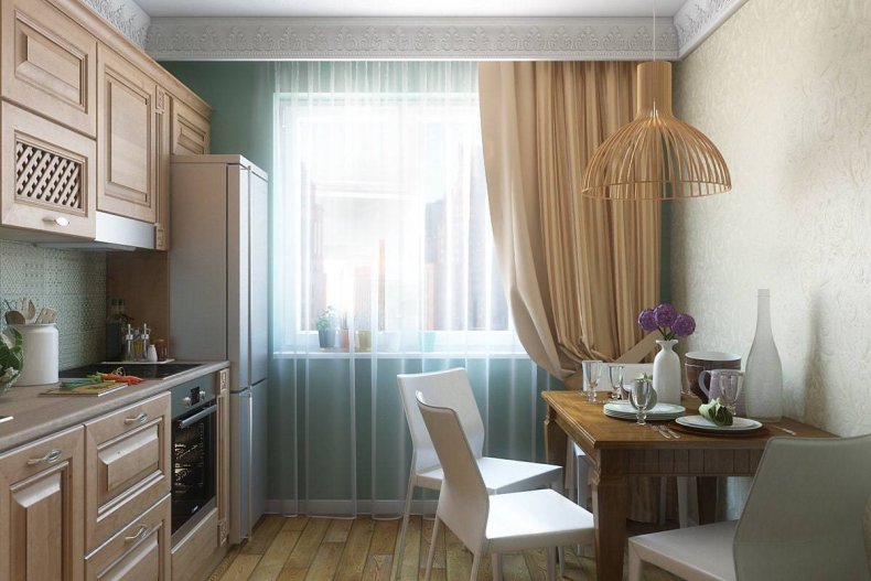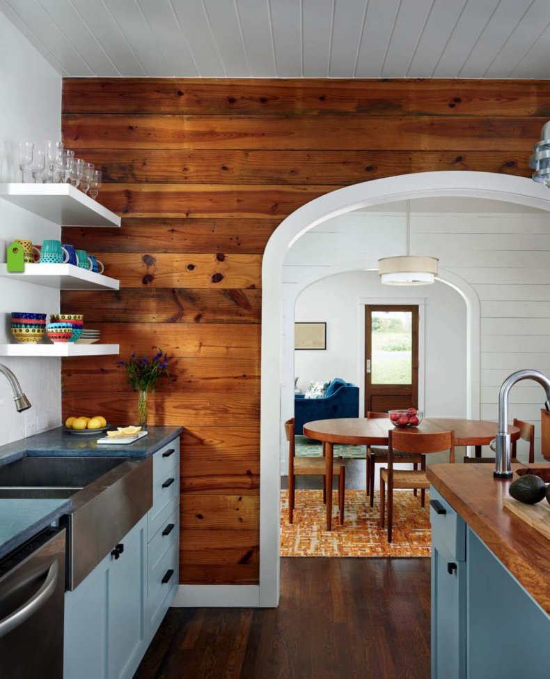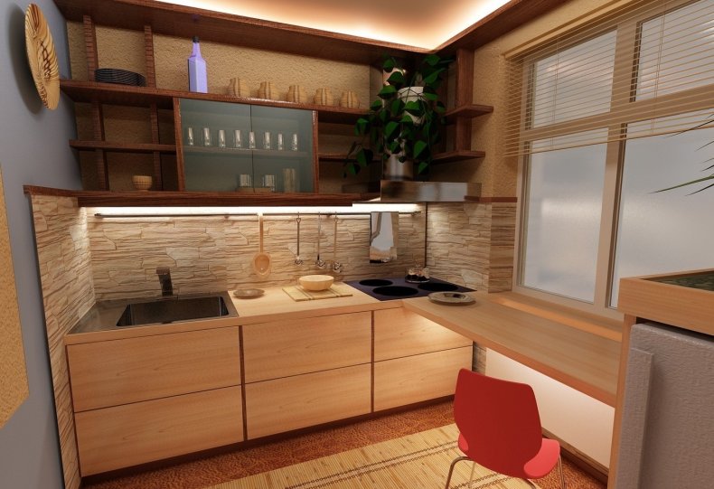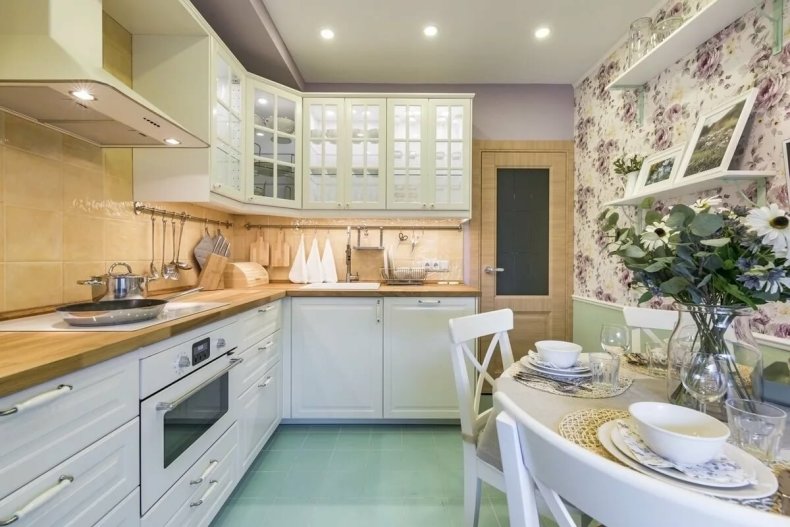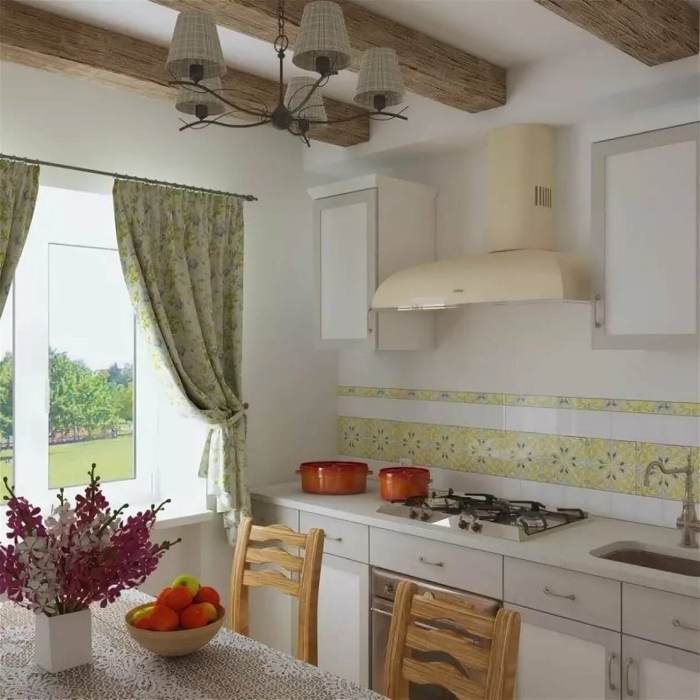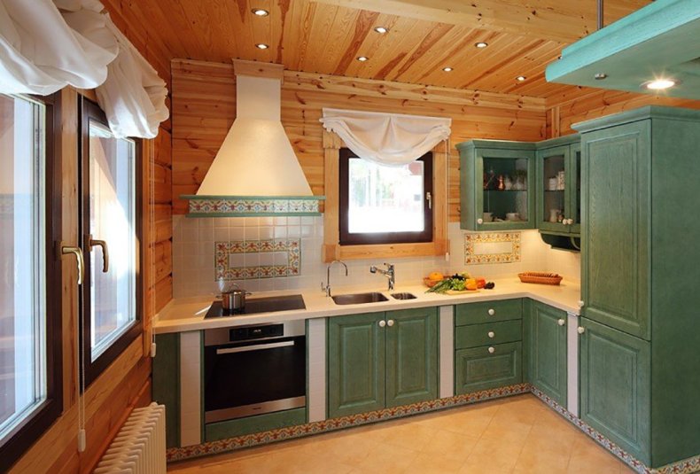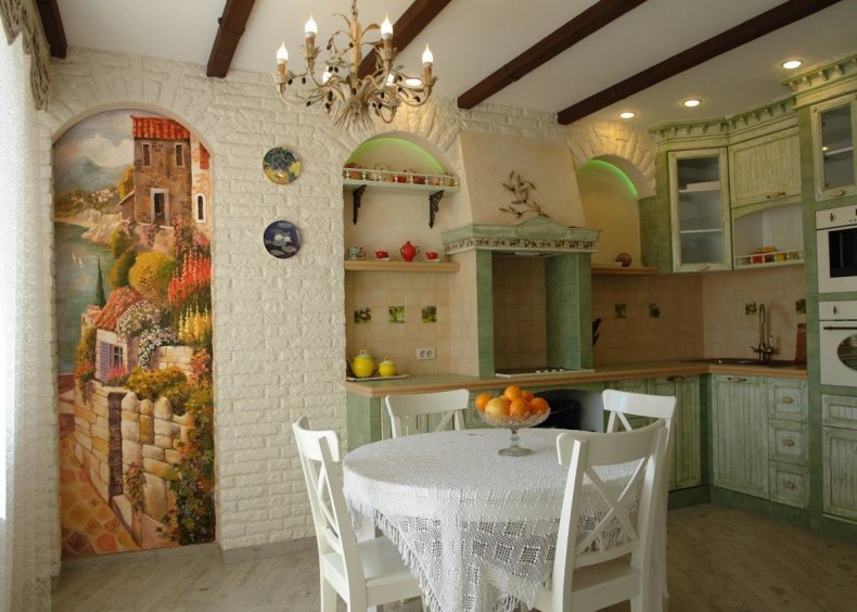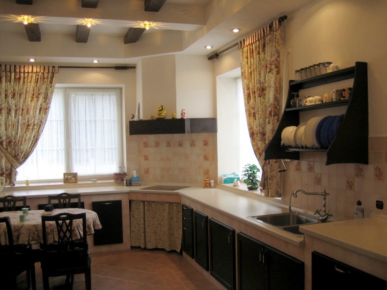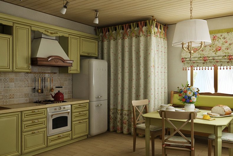 - Кухню необходимо обставлять обычной деревянной мебелью, у которой есть открытые полки и встроенные ниши;