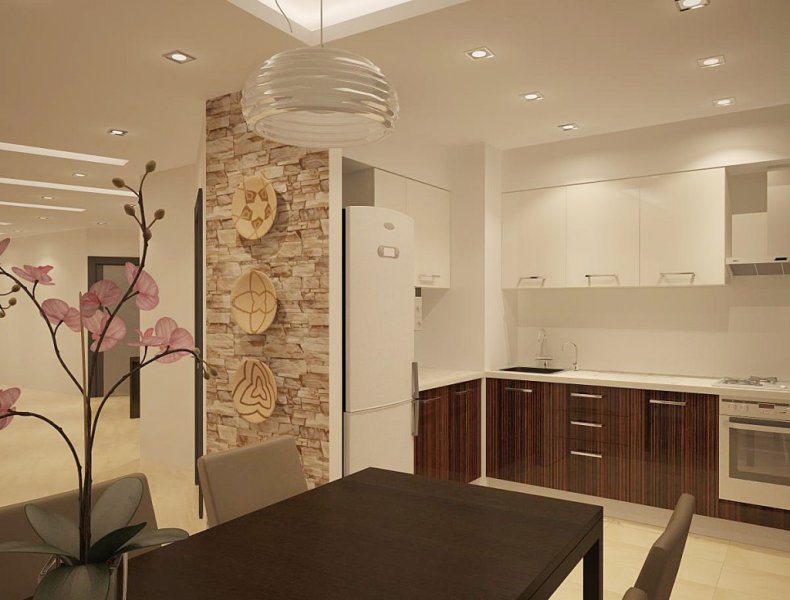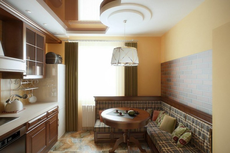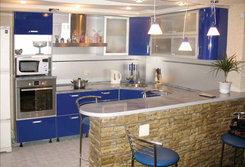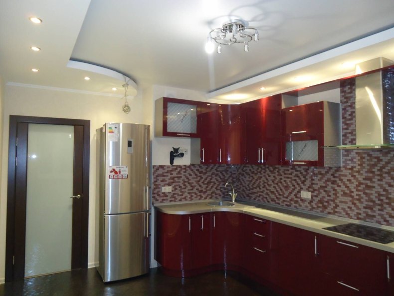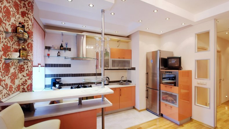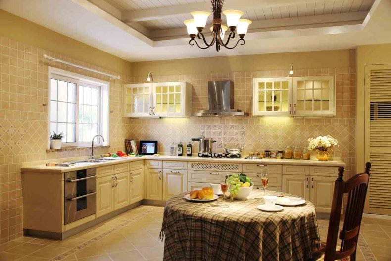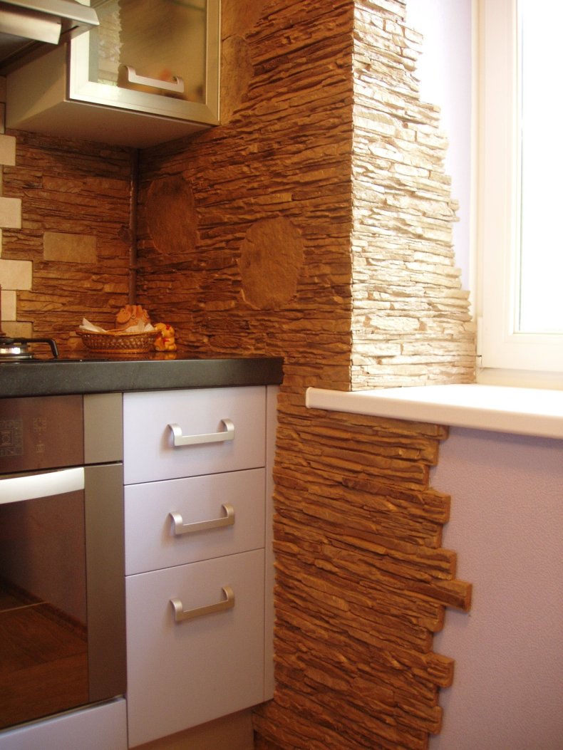 - Для потолка хорошо подойдут обои, пластиковые панели, гипсокартон и шпаклевка. Стены требуют разнообразия, ведь необходимо подчеркнуть рабочую зону. Особой прочностью и недорогой ценой отличаются стены из керамической плитки – они выглядят очень прелестно и легко моются.