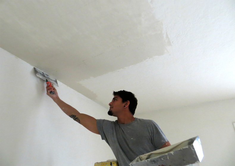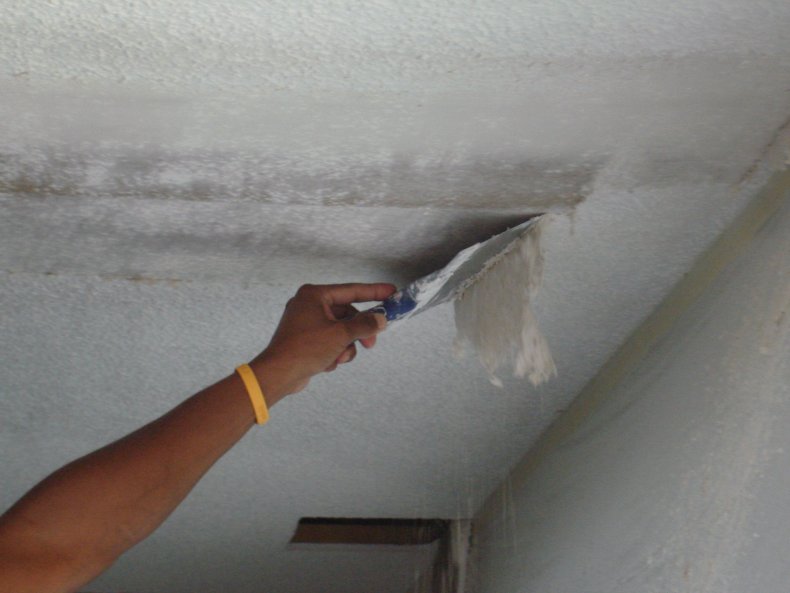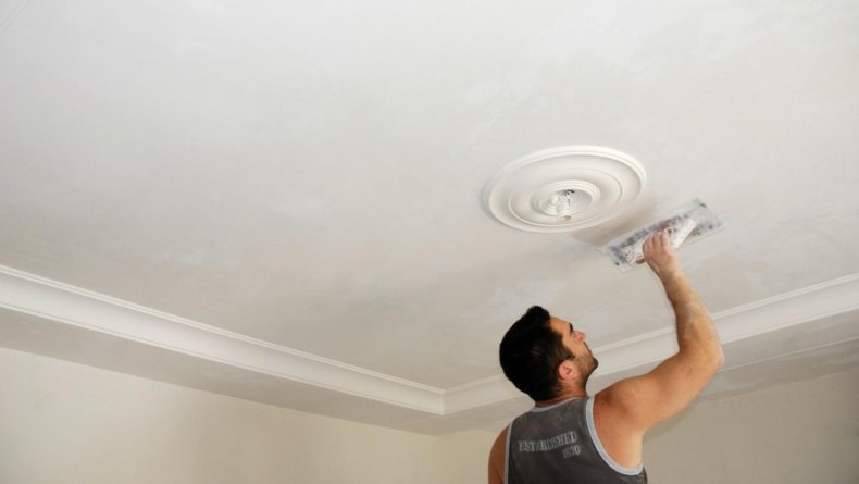 Такой вариант могут применить даже новички. Этот способ будет попроще предыдущего. В магазине приобретается сухая цементная смесь, смешивается, согласно инструкции и шпателем накладывается на потолок.