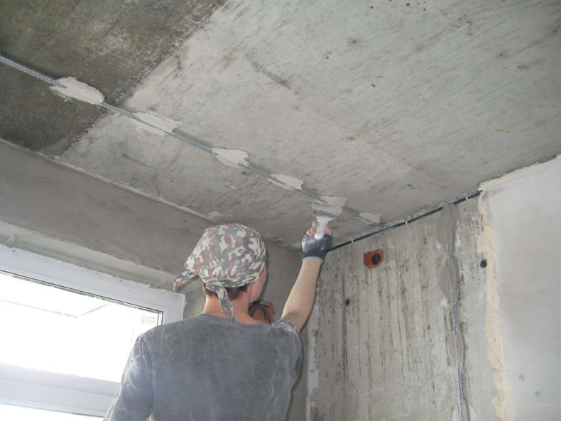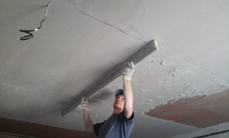 - После таких действий все неровности и высотные перепады сгладятся, а потолок подготовлен к штукатурке.