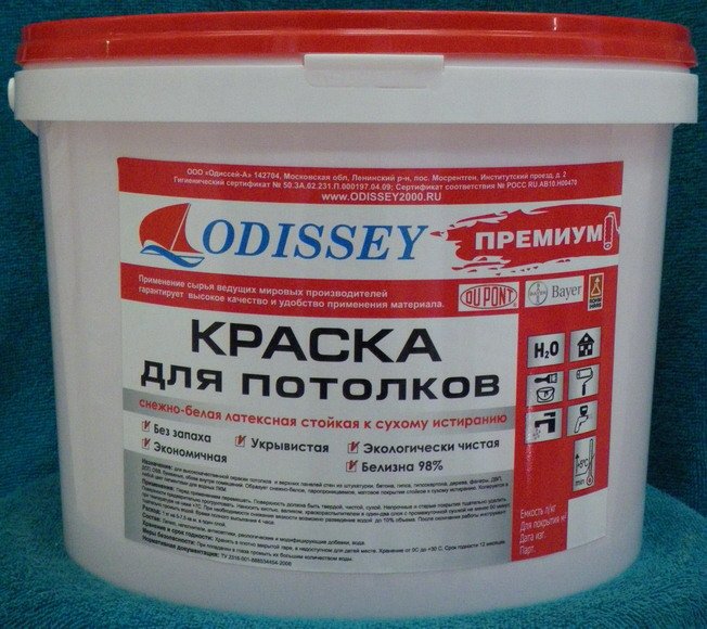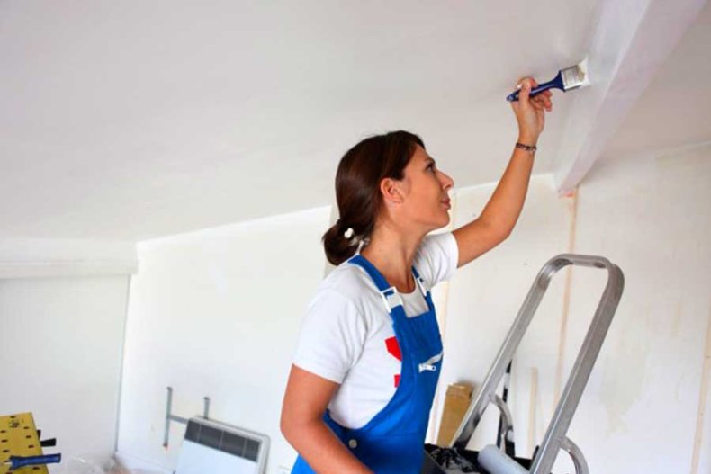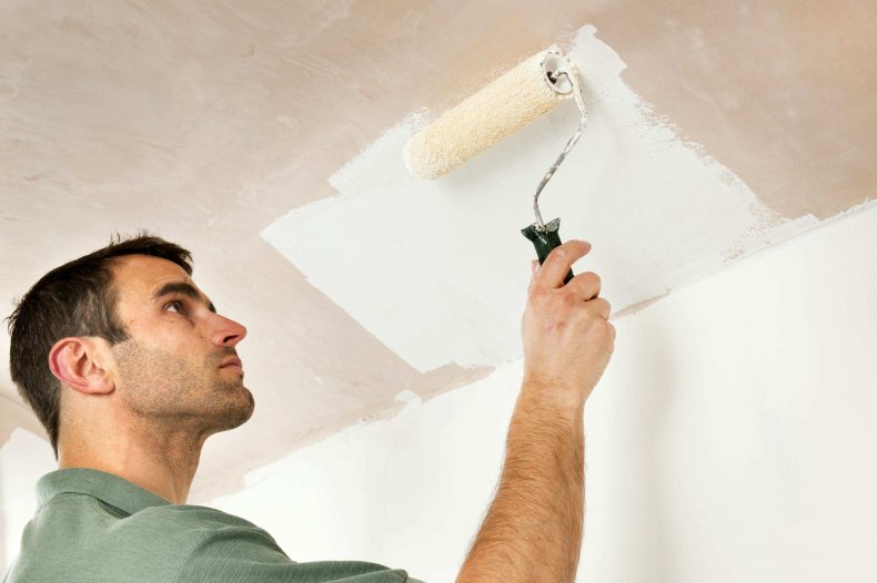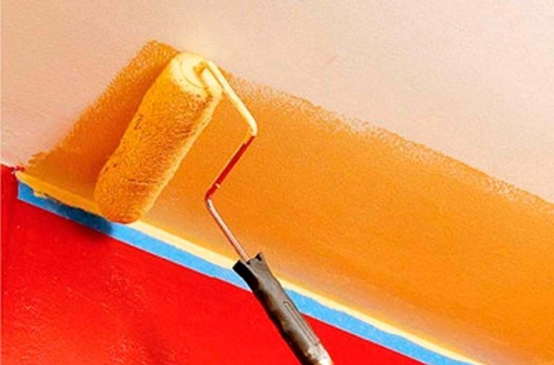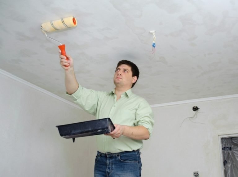 - Окуная валик, краска наносится тонким слоем на потолок, а после высыхания необходимо пройти ещё раз.