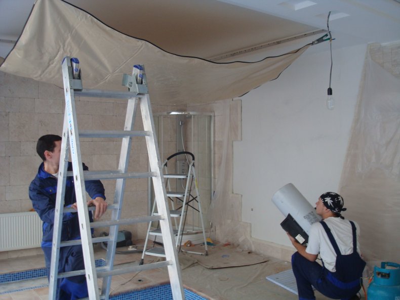 Здесь понадобится достичь исключительно гладкой плоскости. Для натяжных и подвесных потолков такая основательная подготовка не нужна. Хватит только убрать отставшее покрытие, чтобы оно не нанесло вреда подвесным структурам.