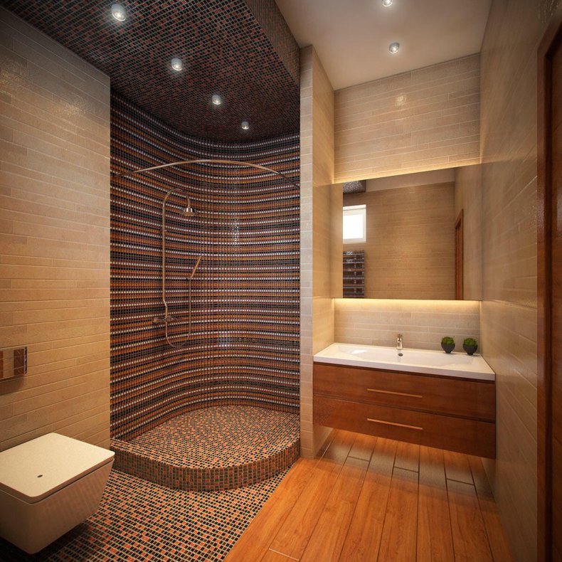 В первую очередь необходимо выбрать оптимальное место для расположения коммуникаций и сантехники, определиться с материалом, а затем переходить к выбору цветовой гаммы и оформлению общего интерьера помещения.