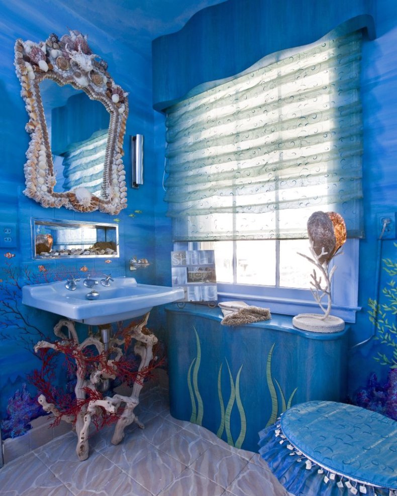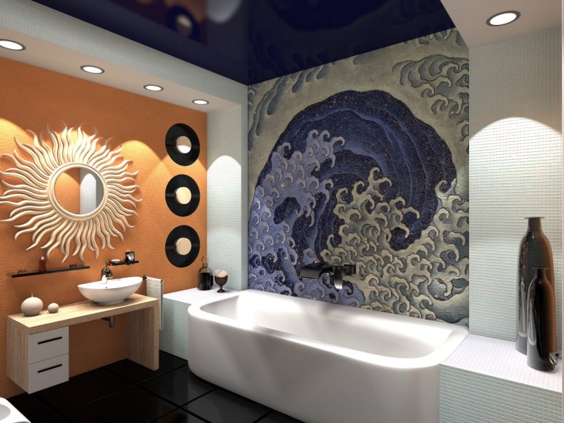 В настоящее время такой вариант медленно, но верно набирает популярность. Обои придают ванной комнате особый уют, а главное их преимущество заключается в том, что если наскучила расцветка, то материал легко можно заменить новым.