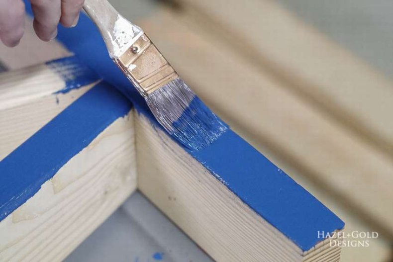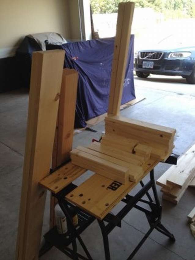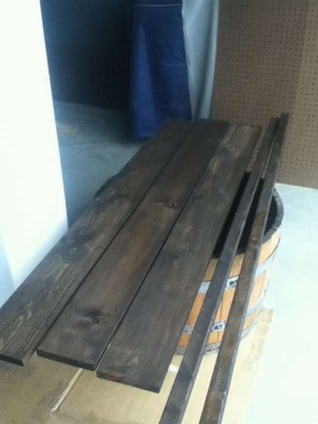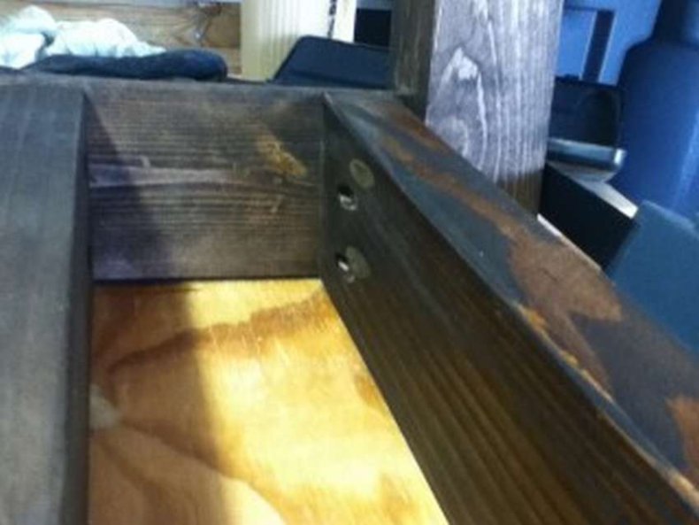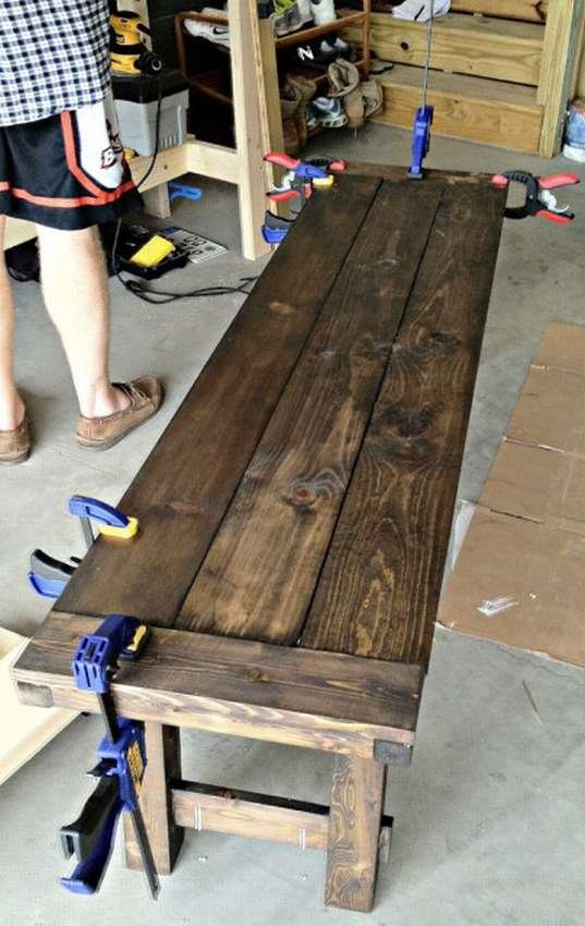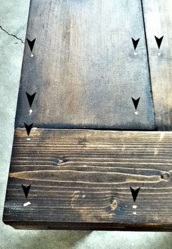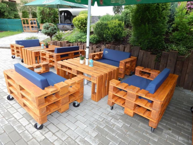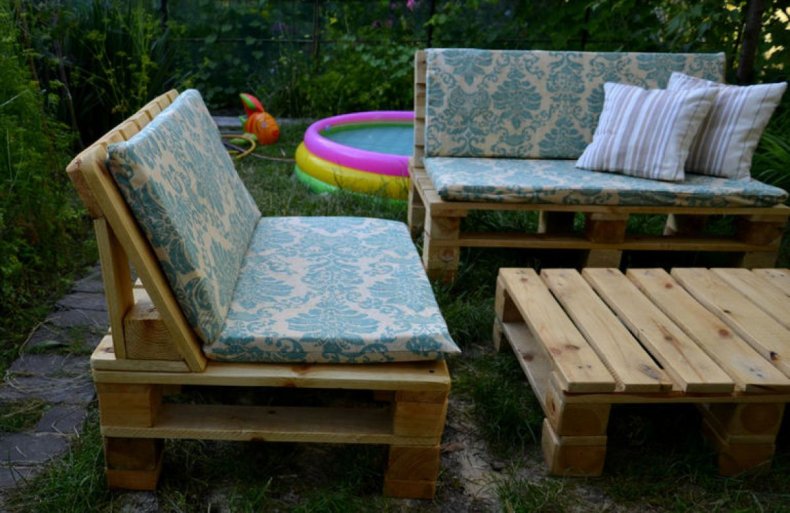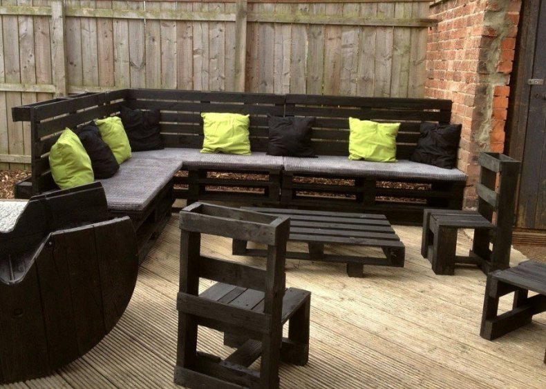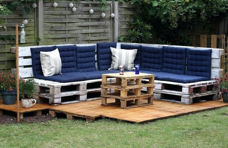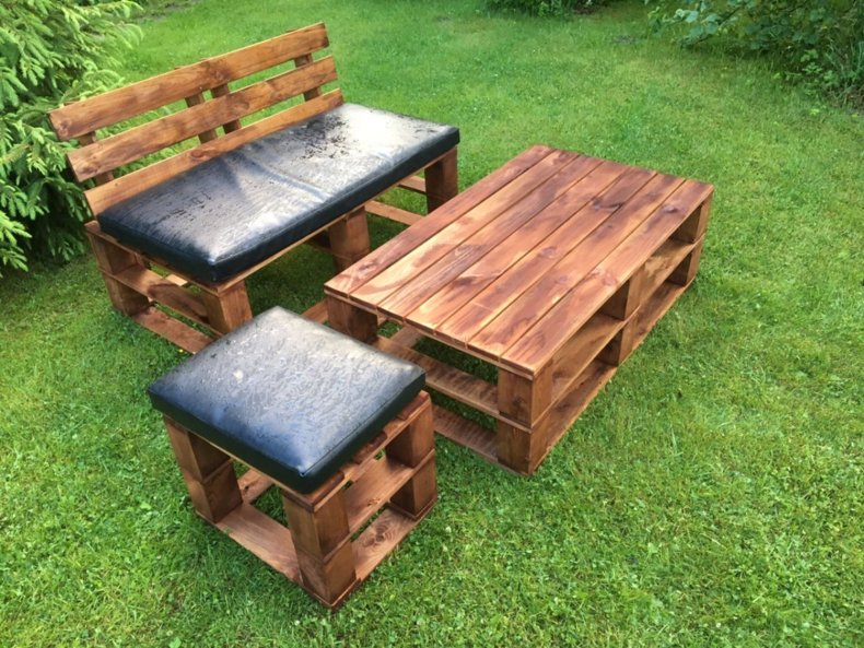 - 8 паллетов и 6 штук шлифуют, красят и покрывают лаком. Размещают буквой Г на поверхности, прибивают спинки сзади.