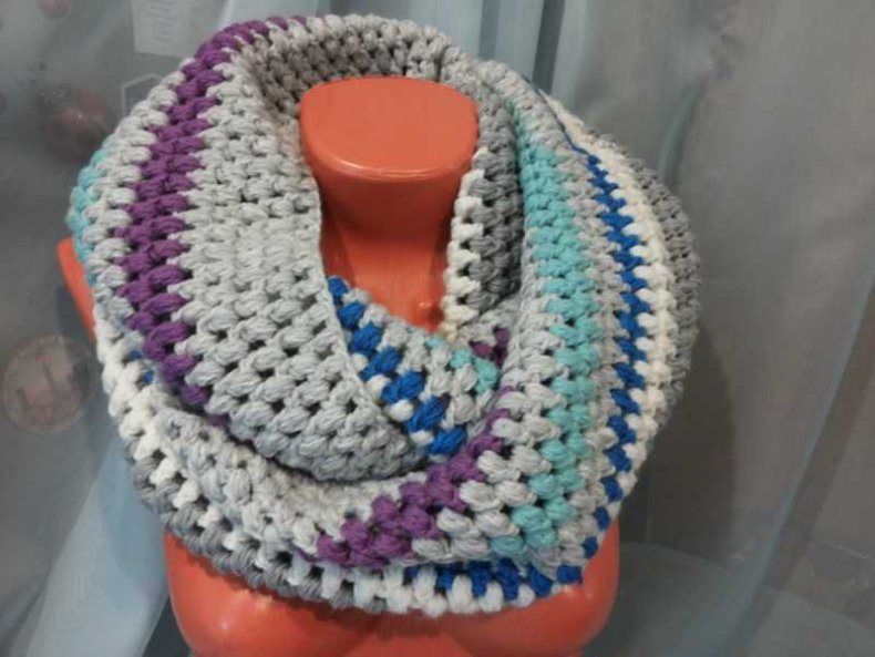 Наконец, все, что вам нужно сделать, это обрезать рабочую нить, протянуть ее через последний существующий стежок и прошить нити иглой для штопки. Снуд готов и может наступить зима.