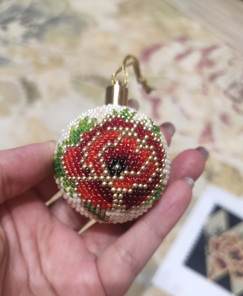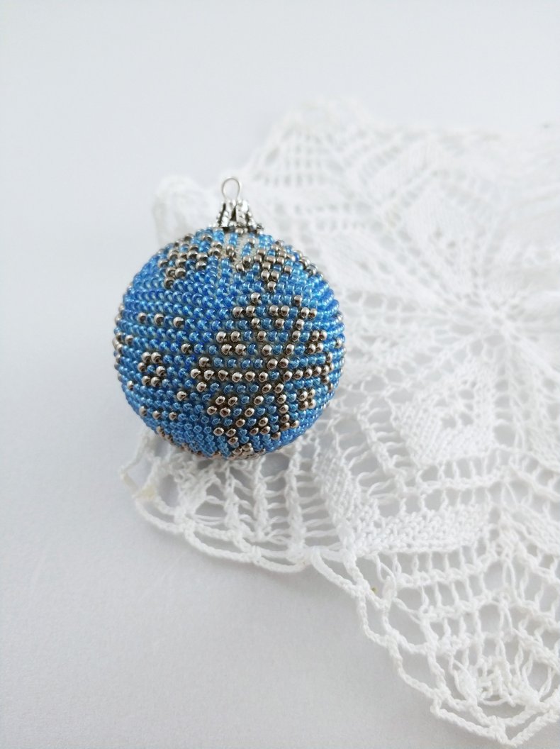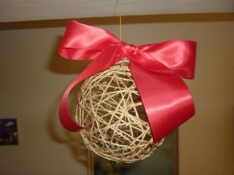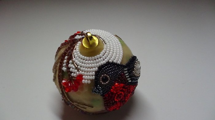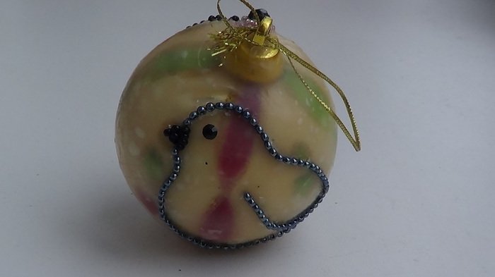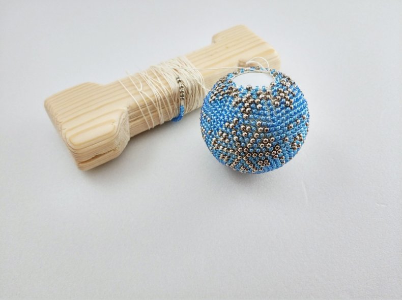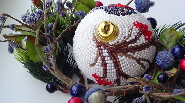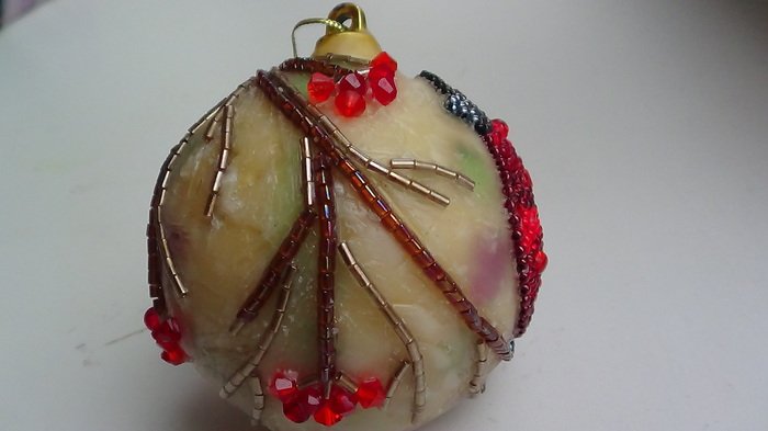 Декор шара при необходимости дополняется золотистыми или серебряными нитями. Чтобы игрушка получилась более объемной, на гвоздик нанизывают несколько бусин.
