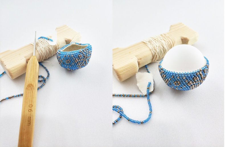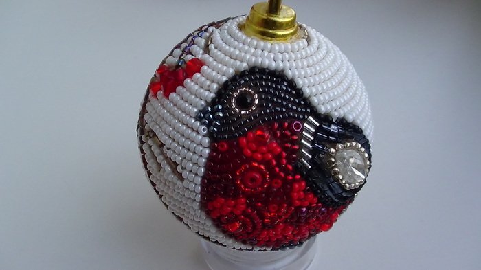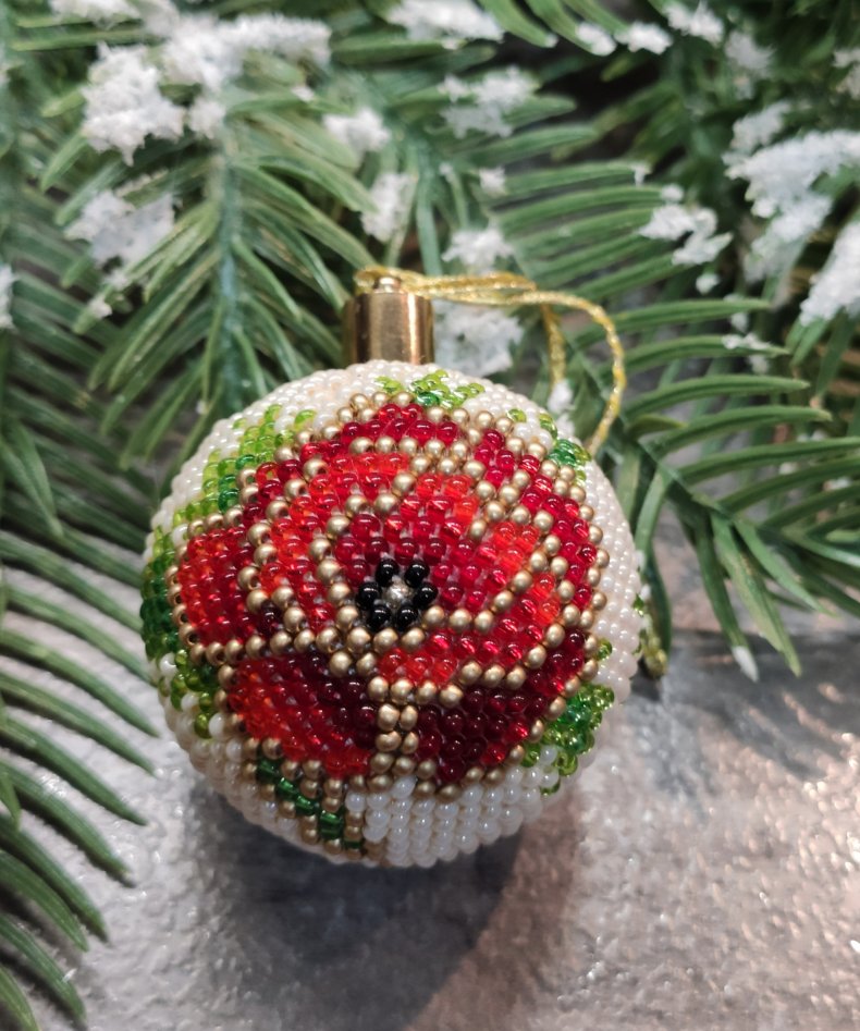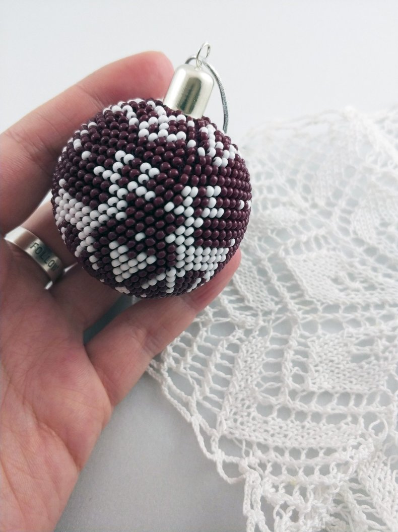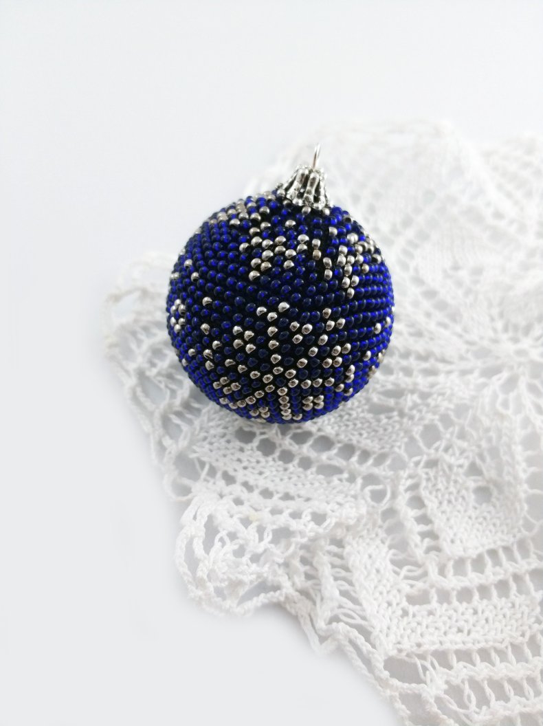 Декор шара при необходимости дополняется золотистыми или серебряными нитями. Чтобы игрушка получилась более объемной, на гвоздик нанизывают несколько бусин.