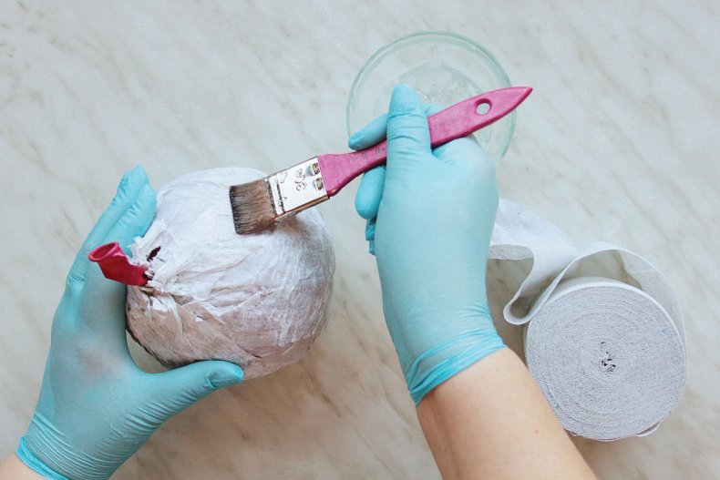 - Смешиваем клей с водой и наносим на поверхность шара в месте размещения аппликации.