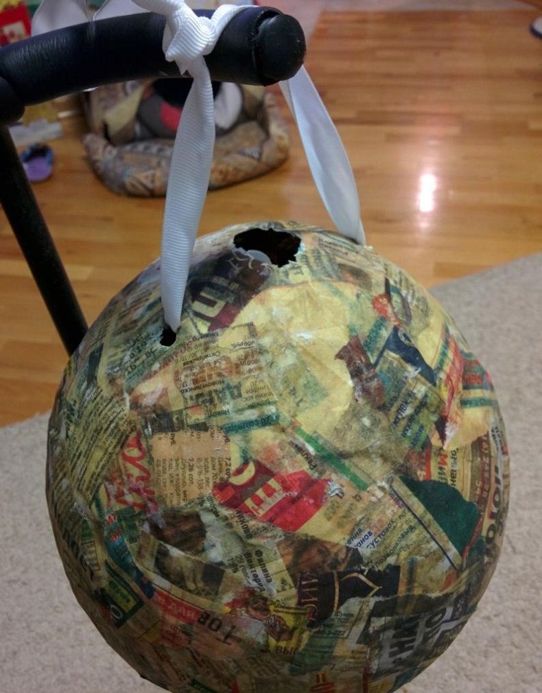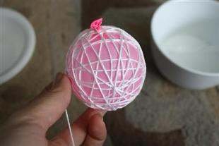- Обматываем шарик, пропитавшимися отрезками ниток в произвольных направлениях, оставляя небольшие просветы.