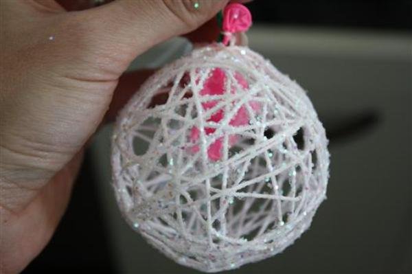 Красочный, стильный шарик из ниток мастерить интересно и легко. Для поделки необходимо приготовить нитки белого цвета, воздушный шар, тюбик клея, различные декоративные элементы.