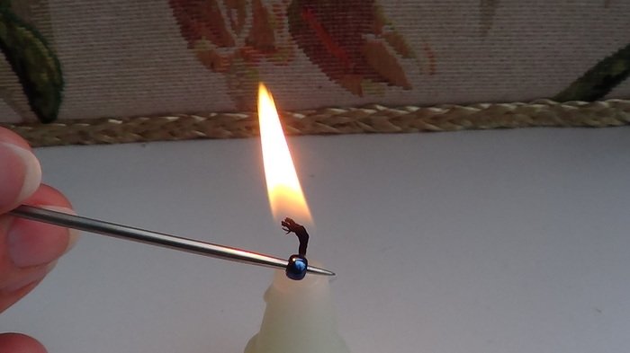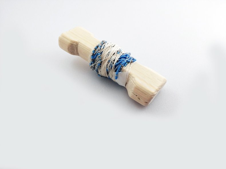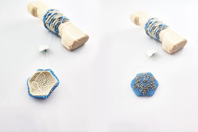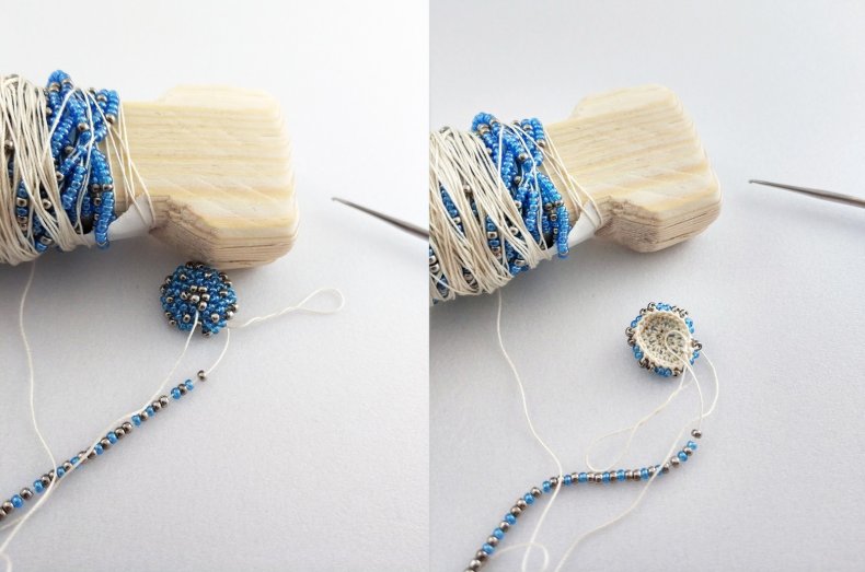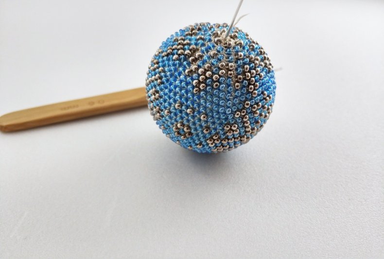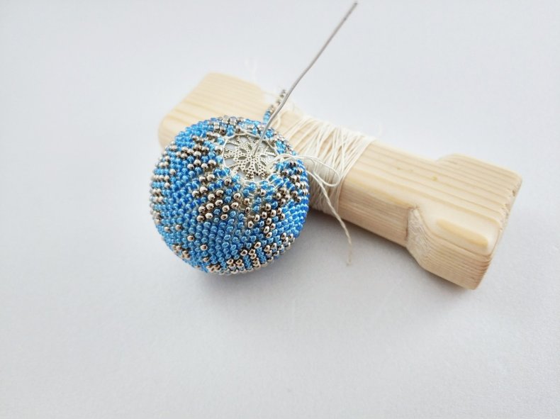 - Нанизываем бусины на гвоздики и втыкаем в пенопластовый шарик на отмеченной линии.
