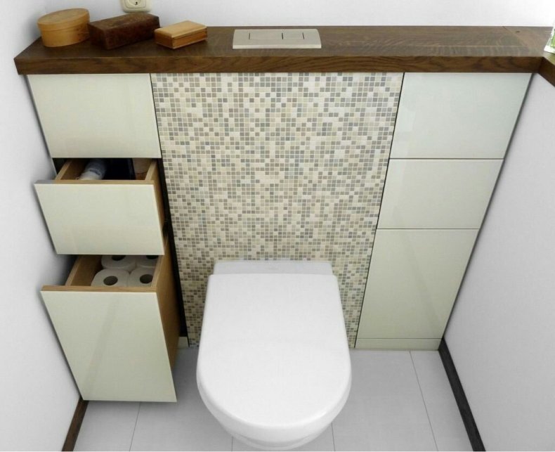 Для многих людей, имеющих ограниченное пространство в туалете, важно использовать навесные шкафы. Они позволят спокойно сидеть на белоснежном троне, не задевая спиной или головой шкаф.
