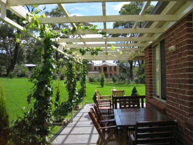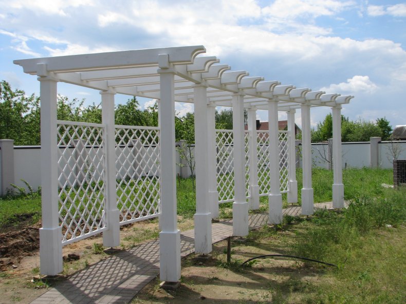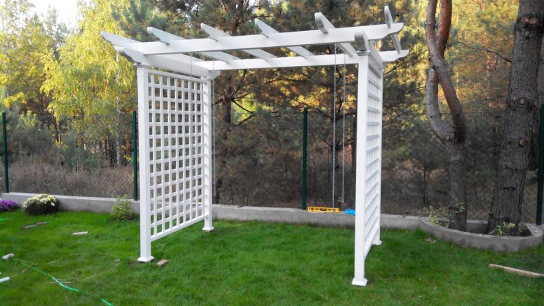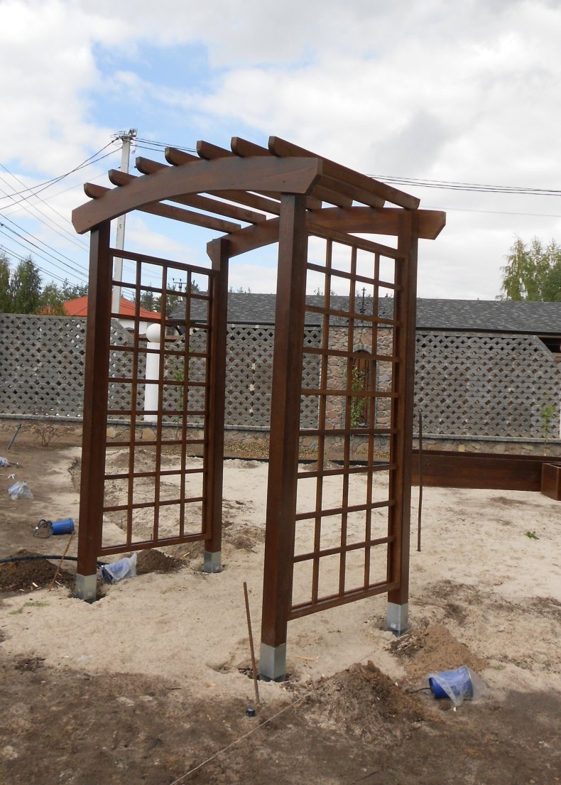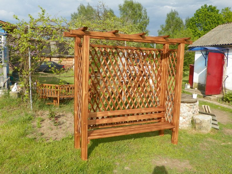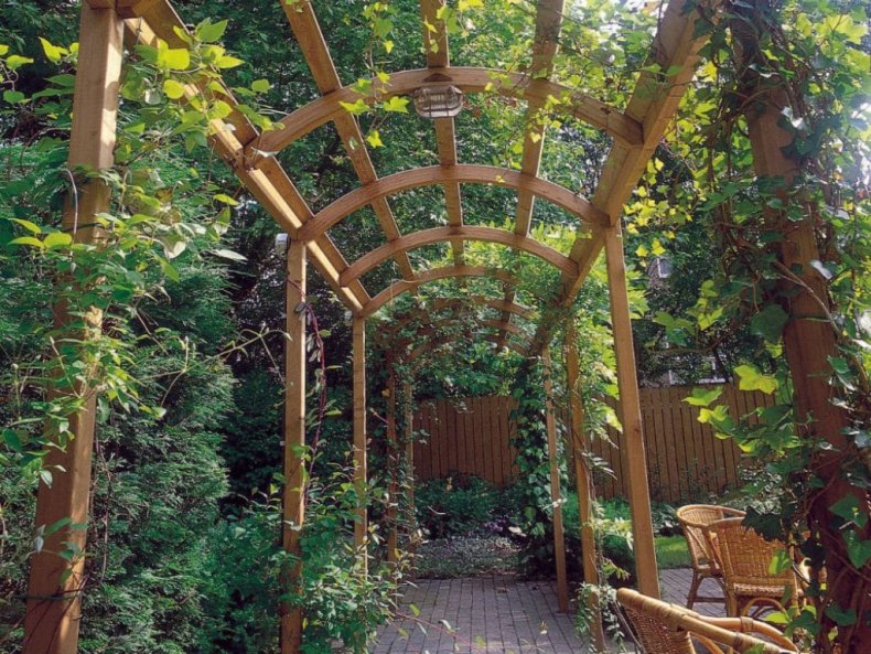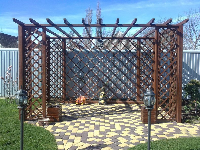 Такие конструкции могут быть, как готового вида, так и подлежат самостоятельному созданию. Они обычно применяются на участках с малой площадью. Служат также затемнением пространства, под которым можно установить место отдыха с шезлонгом и столом со стульями.