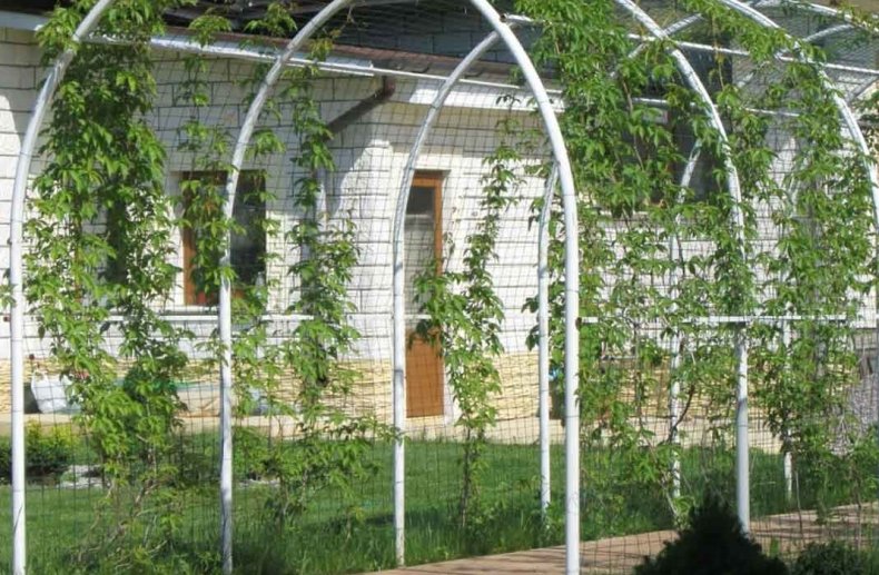 Для изготовления применяется дерево или металл. Подходит для крупных сортов винограда. Представляет собой конструкцию из нескольких арок с решеткой. Но обладает рядом достоинств.