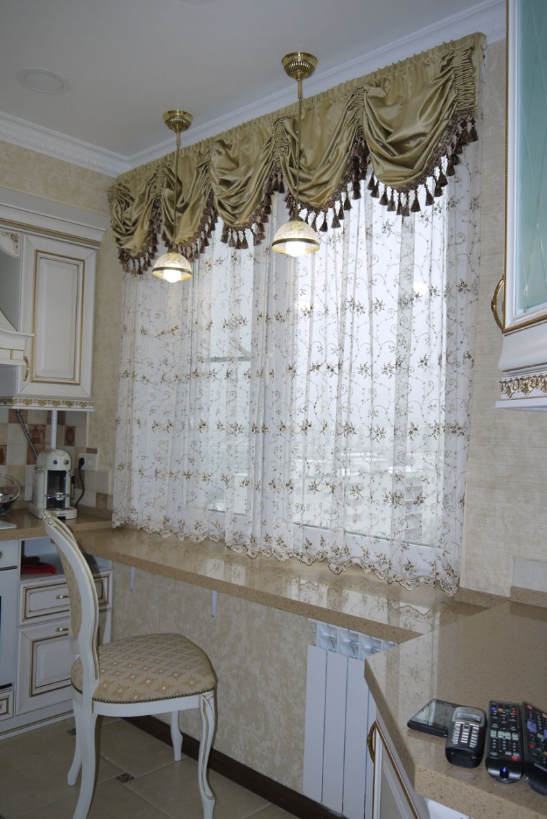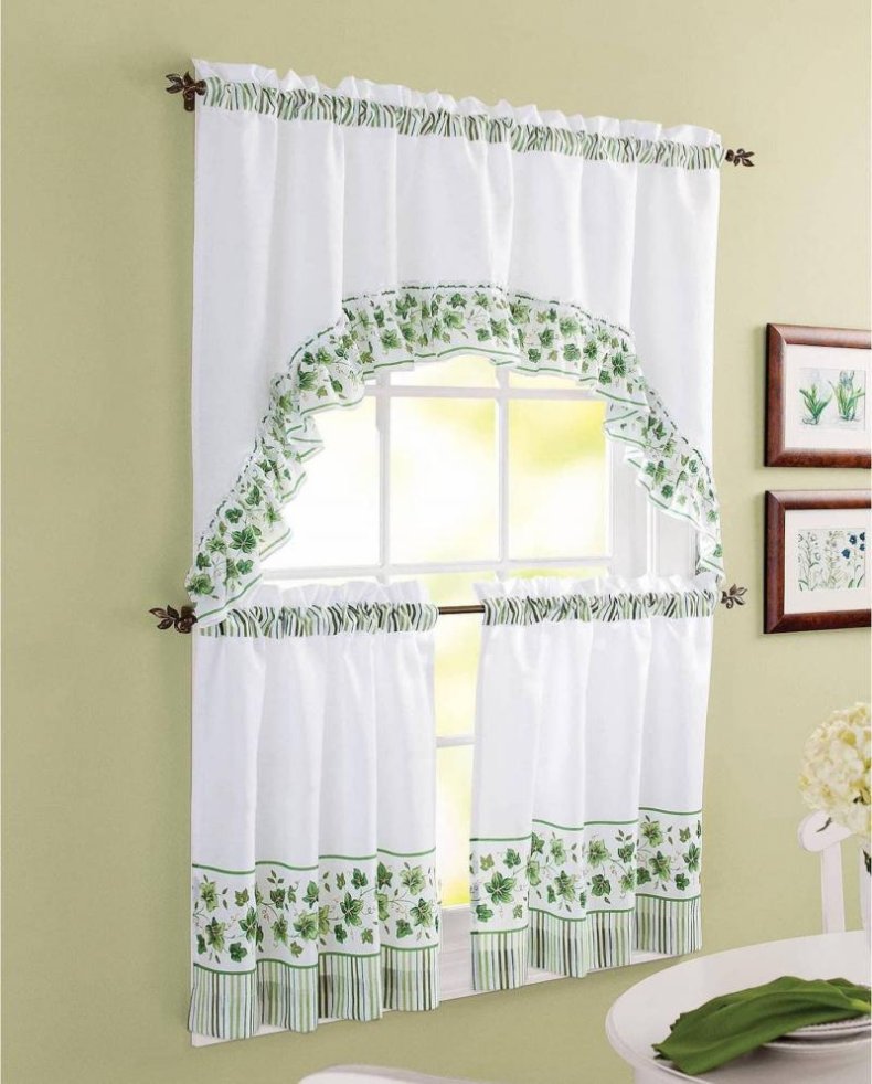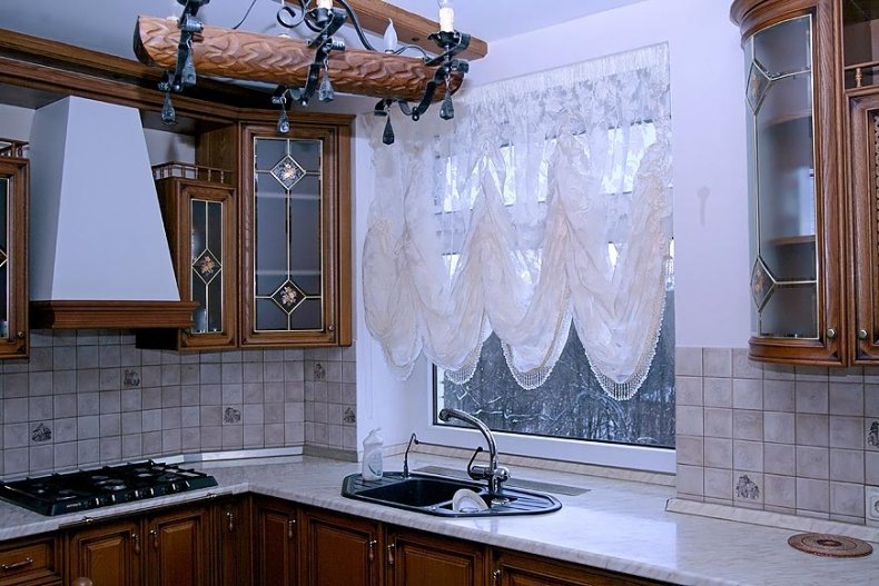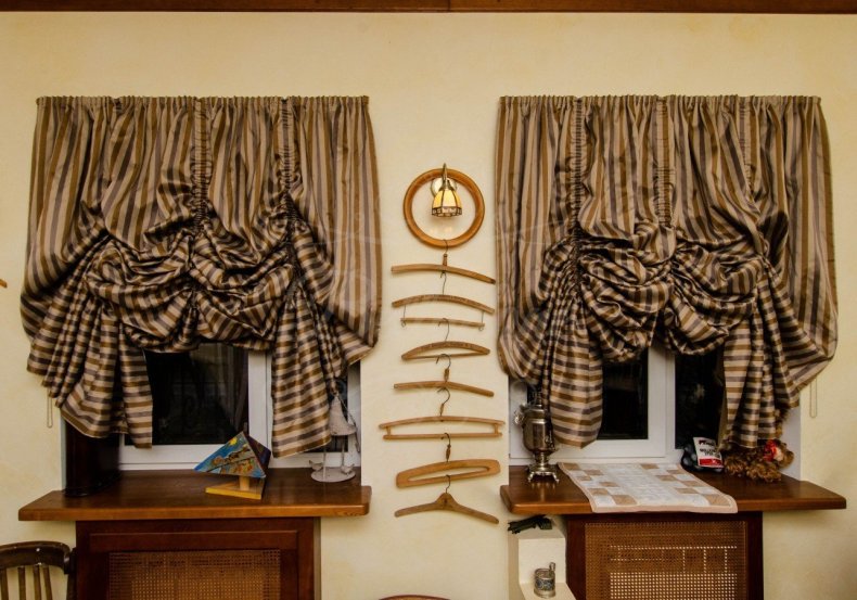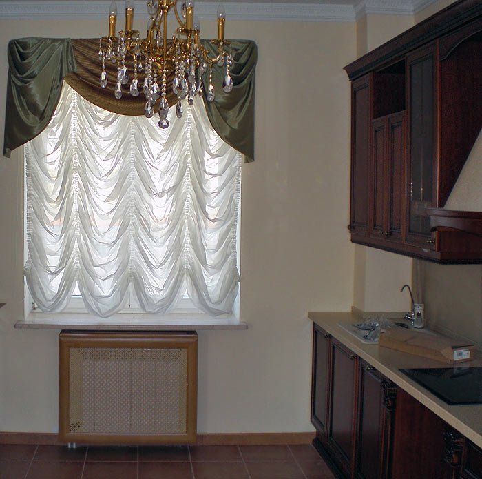 - «Кафе шторы» помещают, например, на нижнюю половину кухонного окна.
