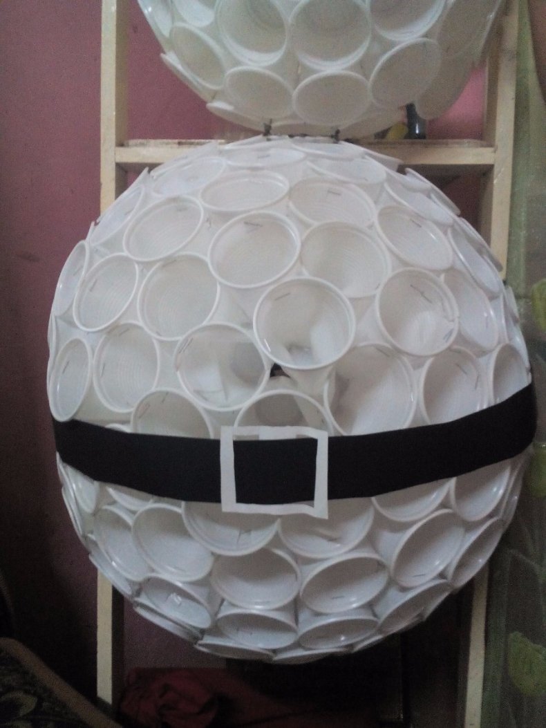 - Голова должна быть круглой, чтобы создать веселое впечатление о поделке. Можно взять белый шарик для пинг-понга, который аккуратно разрезают пополам. Верхнюю часть крепят к вершине стаканчика. Обычно применяют двусторонний скотч или же клей. На голове можно сделать рисунок. Например, изобразить черным фломастером волосы.