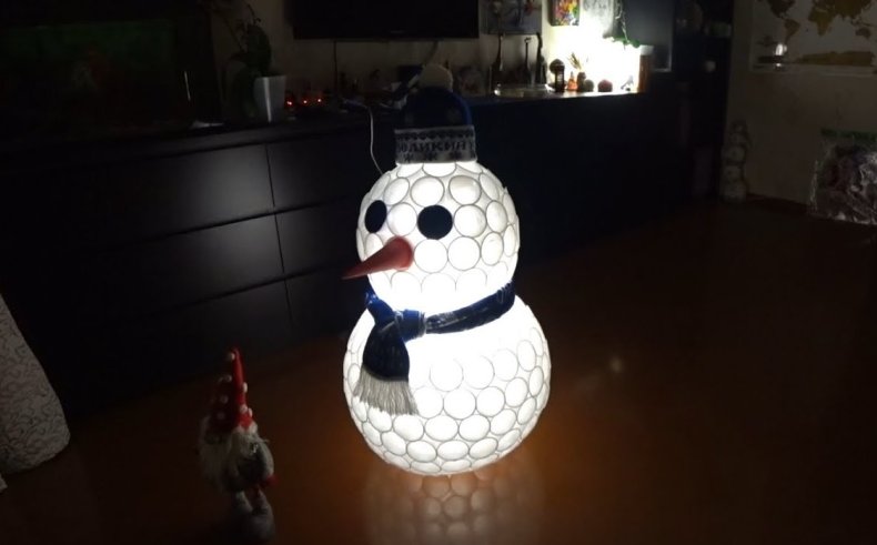 Вот и весь снеговик. Работа готова. Но существует и «Царь-снеговик». Так называют авторскую работу из пластиковых стаканов, которая отличается от других типов снеговиков серьёзным масштабом и качественной проработкой. Про неё стоит написать.