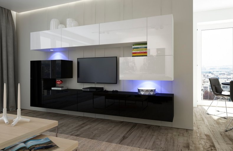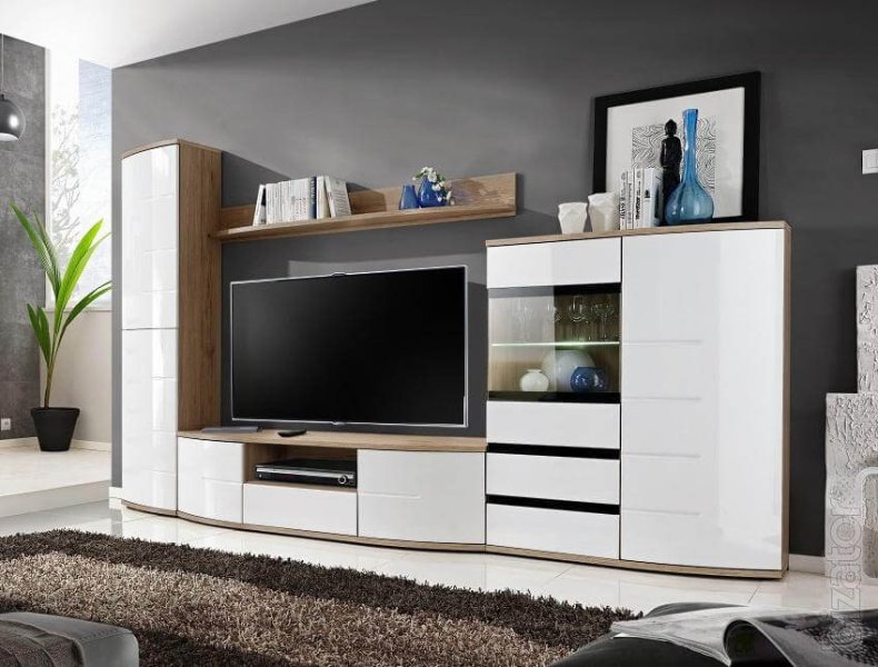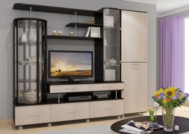 - Современная стенка – допускает подвесной (настенный) монтаж, дополняется глянцевым фасадом, сочетает фрагменты разной геометрии, имеет небольшое количество основных отделов.