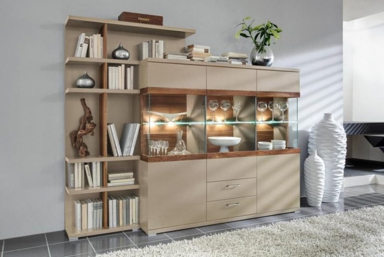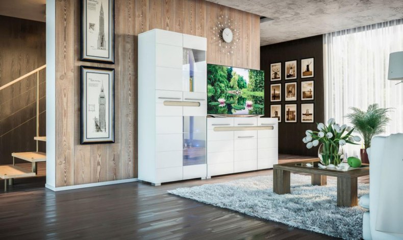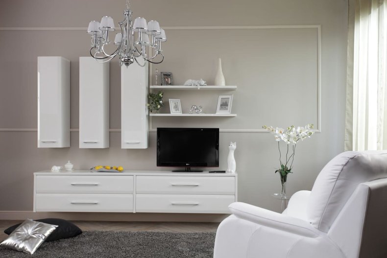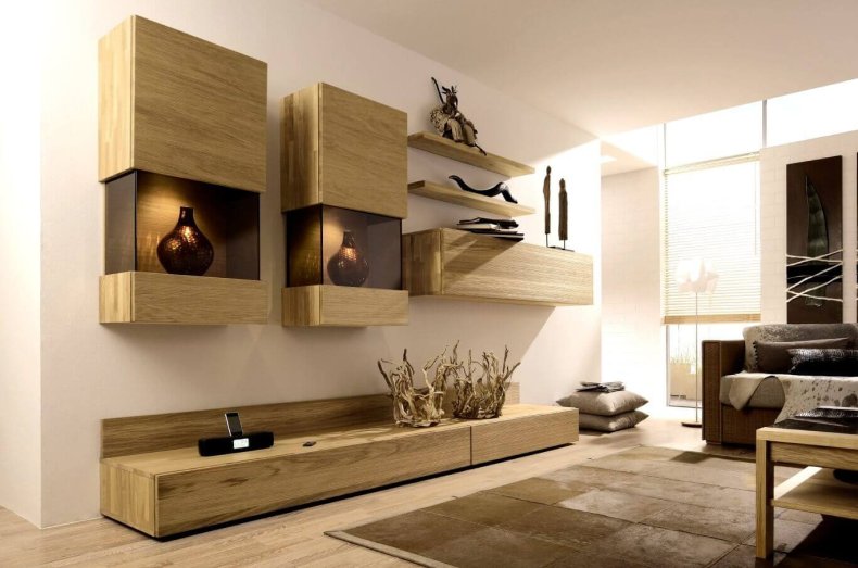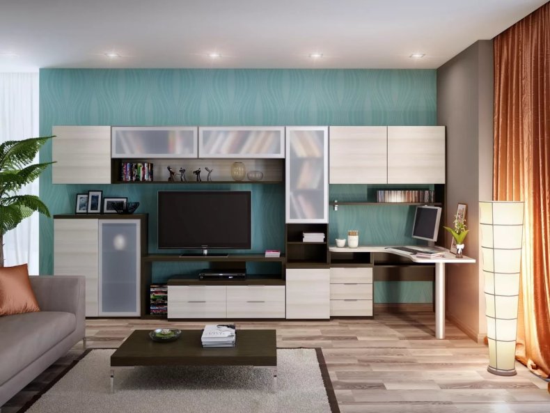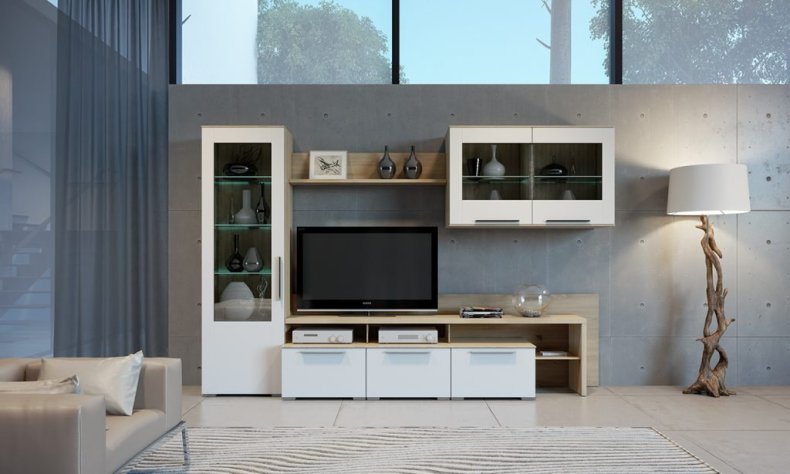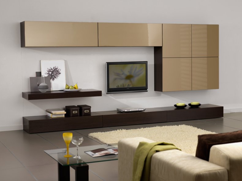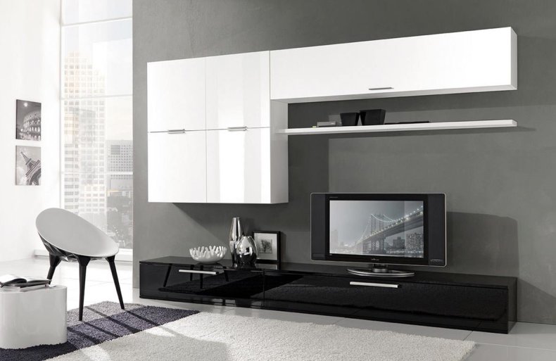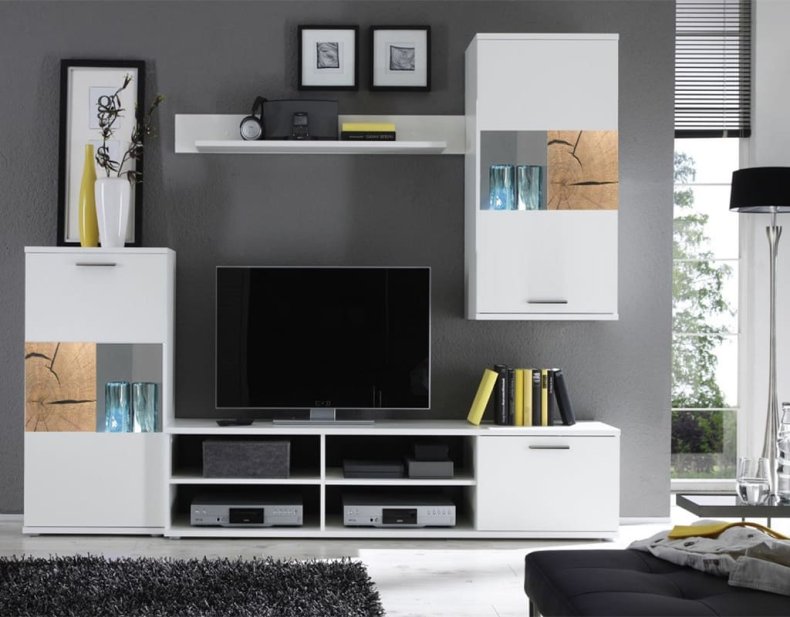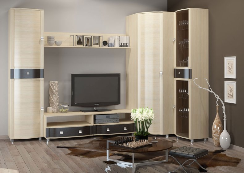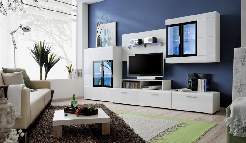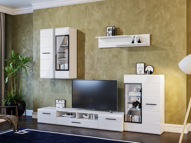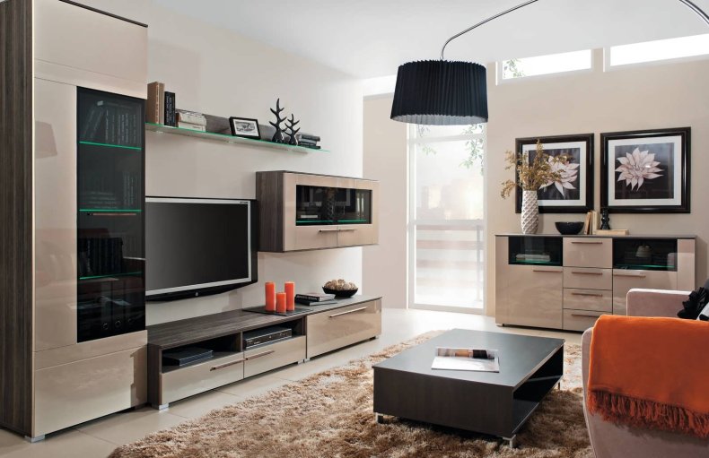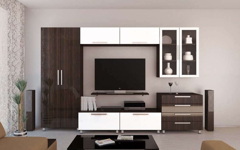Кажется, что одной стенки уже достаточно, чтобы в интерьере гостиной был соблюден декор. Однако это правило относится преимущественно к современным моделям, которые имеют глянцевый фасад и устанавливаются точечным способом за счет ограниченного количества модулей.