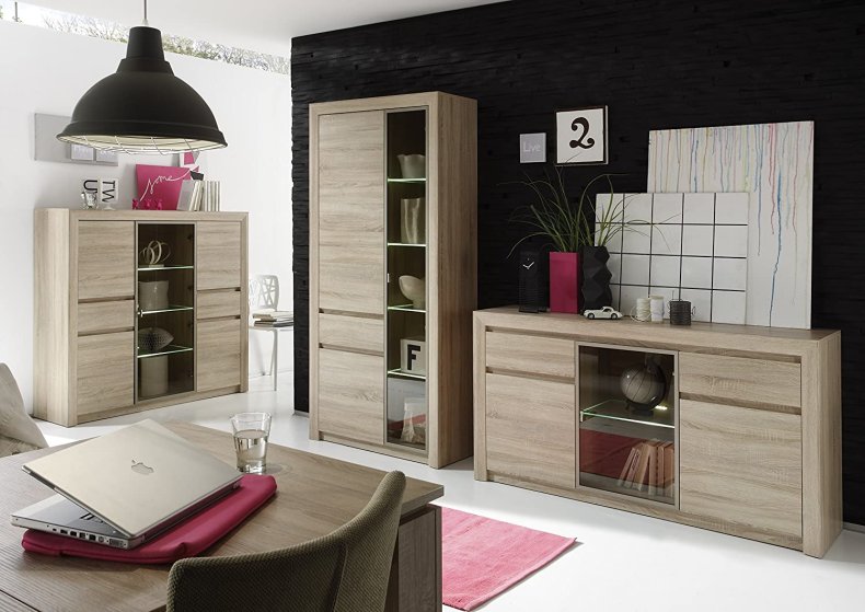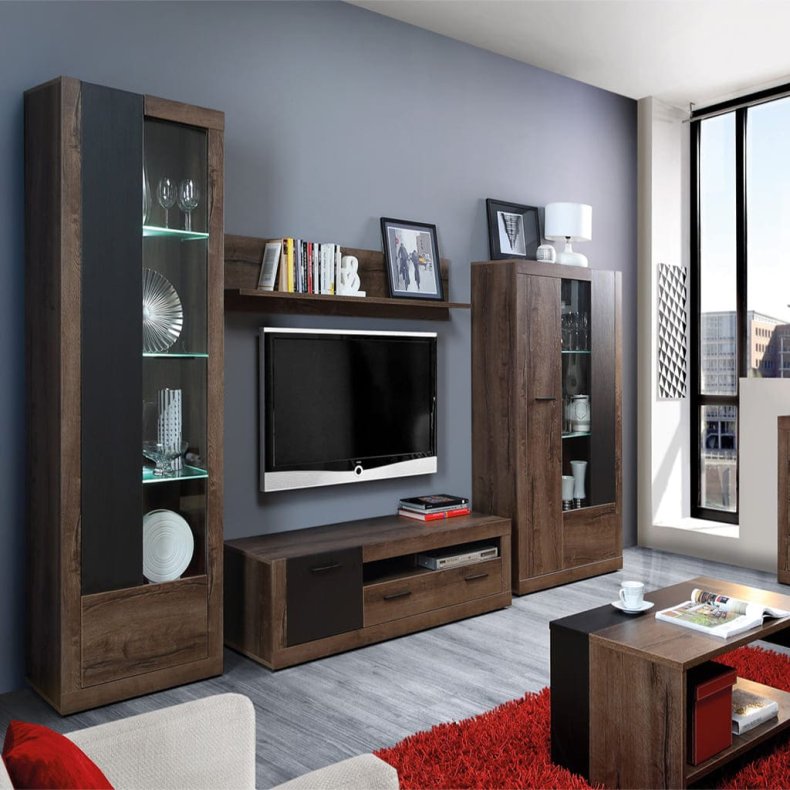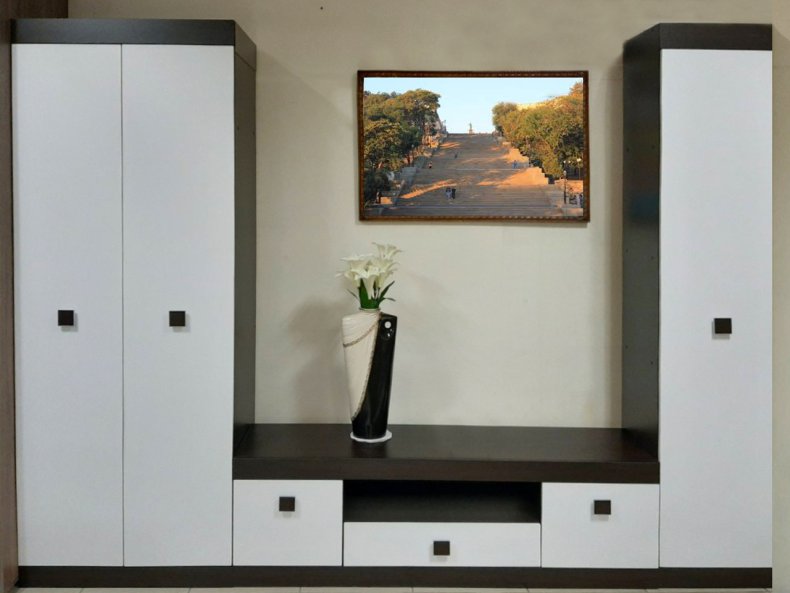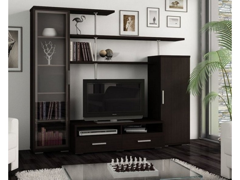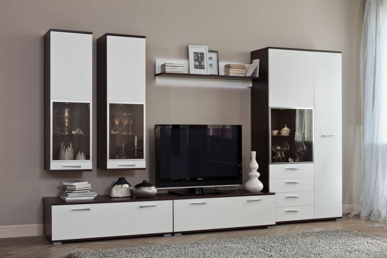 Например, стенка создана для напольной установки, имеет прямую конструкцию, но комплектация модулей не предусматривает сервант и шкаф.