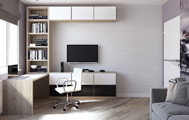 - Подвесной вариант – комплектуется длинной ТВ-тумбой и двумя-тремя пеналами, которые подвешиваются на расстоянии друг от друга и создают свободный «остров» для кинотеатра или модульных картин.
