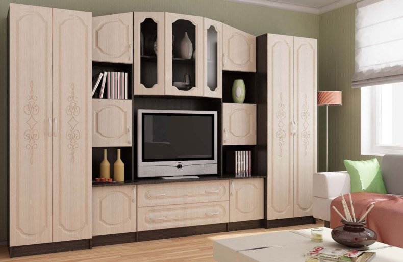 Орех, венге, вишня – большинство моделей стенки имеют расцветку конкретной породы дерева. Причем речь идет о расцветке наружного слоя – шпона или ламината.