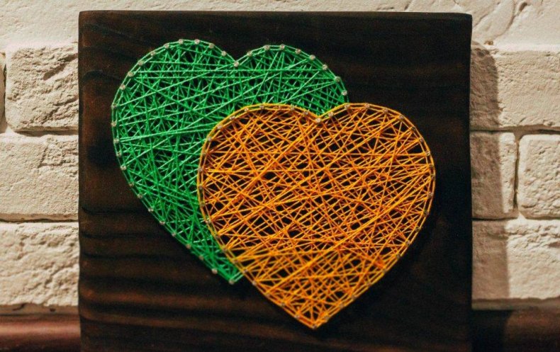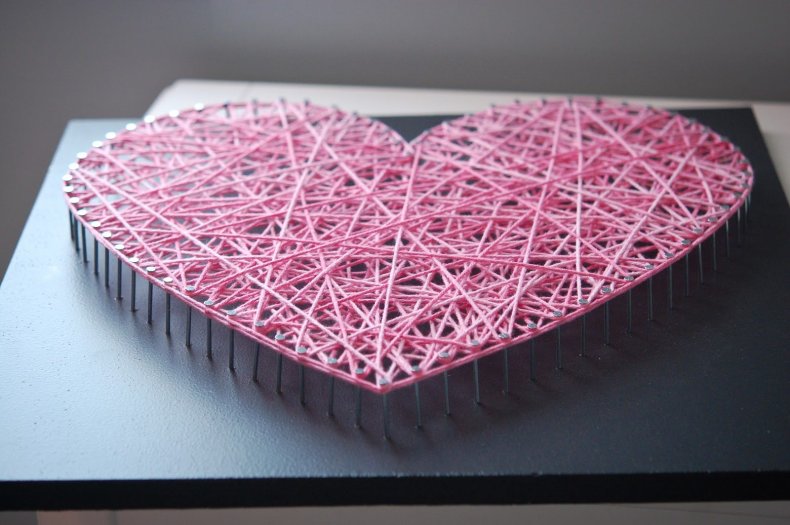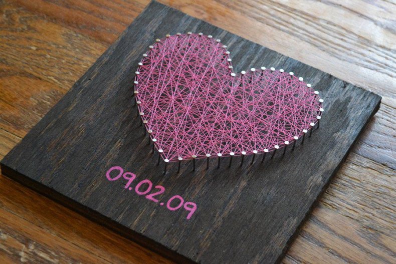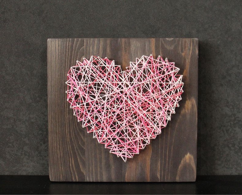 Сердце — элементарное изображения для новичков. Стоит позволить детям создать эту композицию самостоятельно, заранее прибив гвоздики к дощечке. В итоге получаем красивую поделку, украшающую домашний интерьер. Также это хороший подарок родным или друзьям.