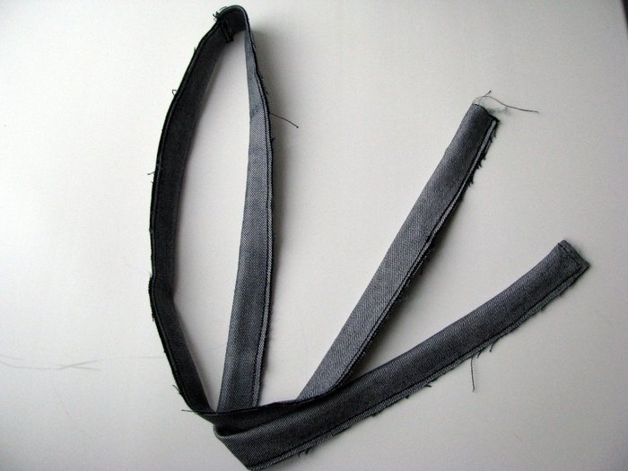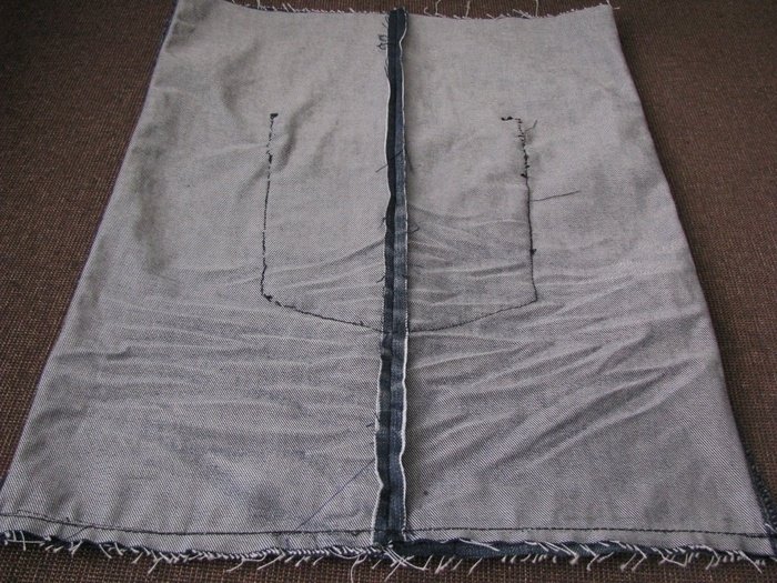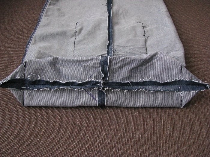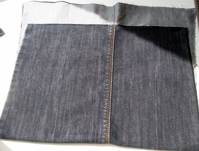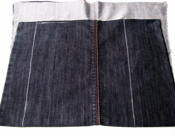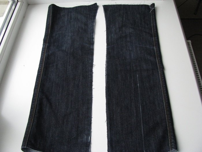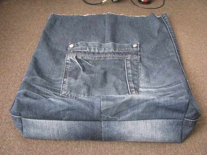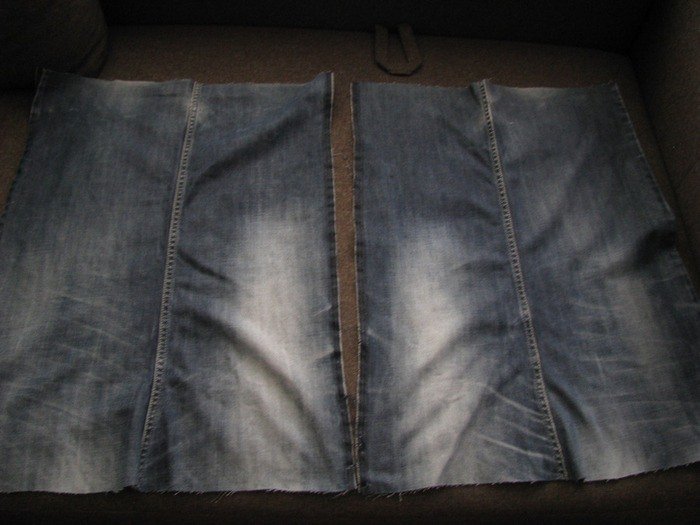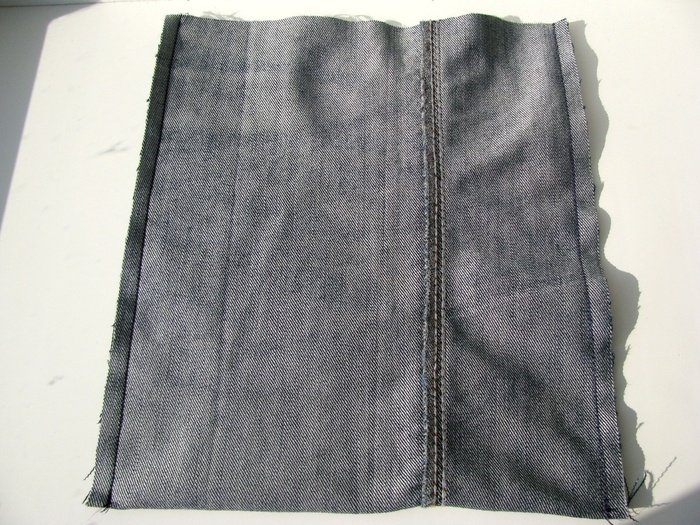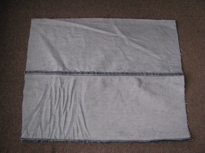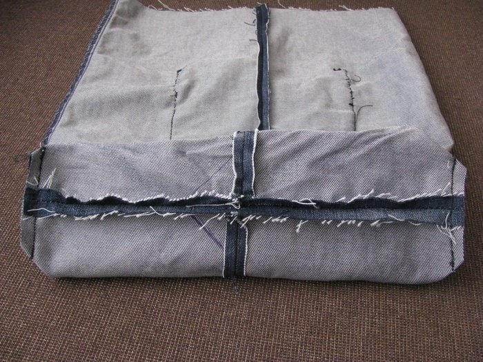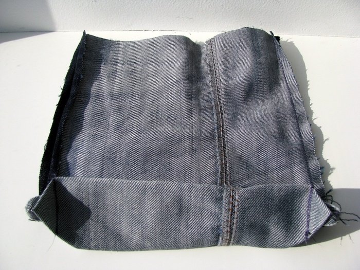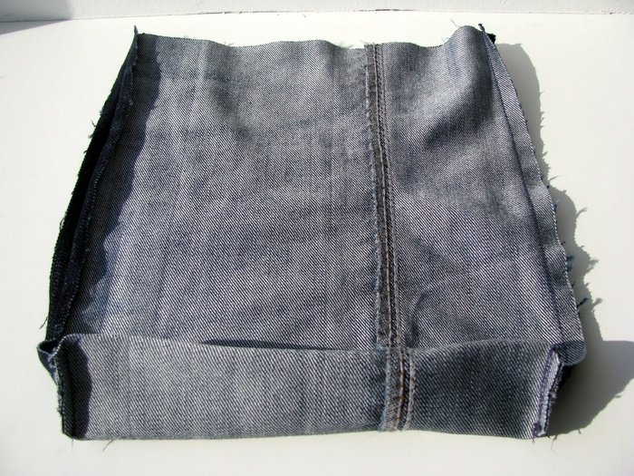 - По потребности выравниваются отрезки джинсы. Бережно сшивается сторона, которая станет наружной частью изделия.