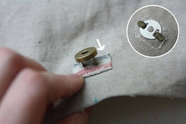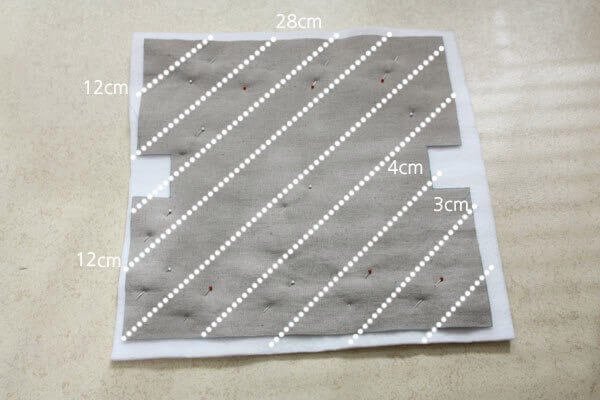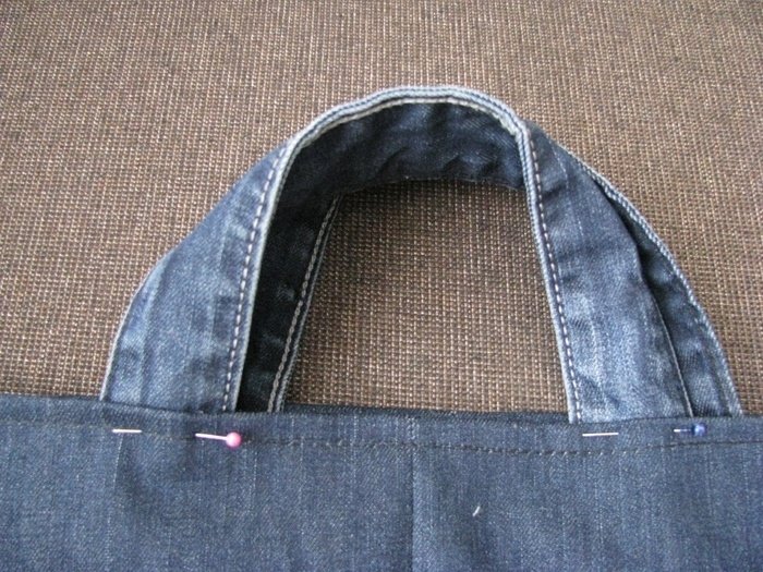 - От шва, находящегося посередине котомки, отступается по 4 см и ручки прикрепляются булавками.