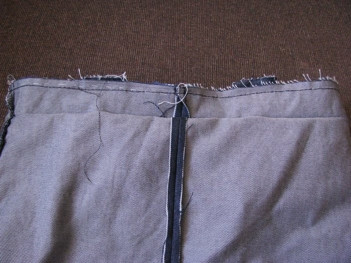 - Со стороны изнанки к молнии зашивается хлопковая деталь. С наружной стороны пришивается джинсовая заготовка.