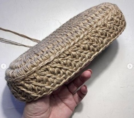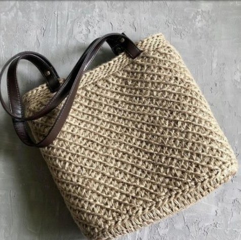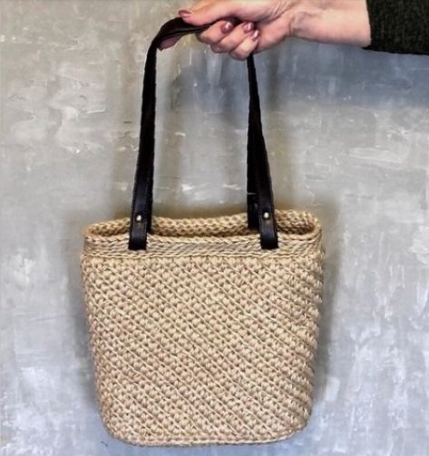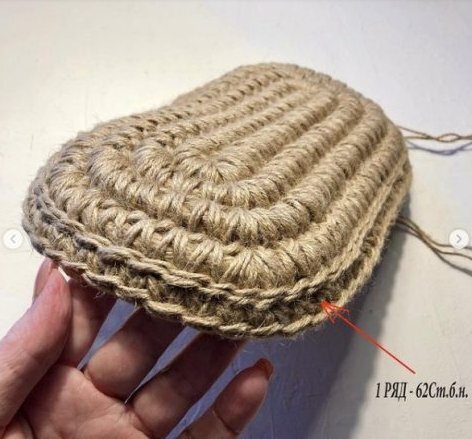 Для нее нужно подготовить кожаную фурнитуру, крючок № 5, канат и шпагат из джута. Вязание будет в 2 нити, расход около 700 гр. Процесс создания состоит из следующих шагов: