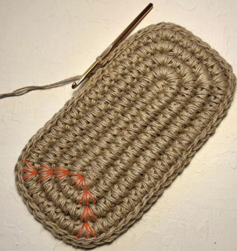 - Набрать 21 в.п. и провязать 5 рядов овала с тремя прибавками. В последнем ряду сделать 2 прибавки.