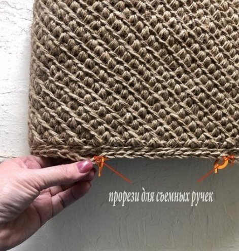 - Определить место для ручек и вместо СБН провязать там в.п. Следующие 3 ряда — СБН, а в в.п. ввязывать один накид.
