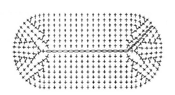 - Связать дно по схеме. Нужно набрать цепочку в.п. в половину желаемой длины. По схеме связать нужный размер и перейти к сторонам.