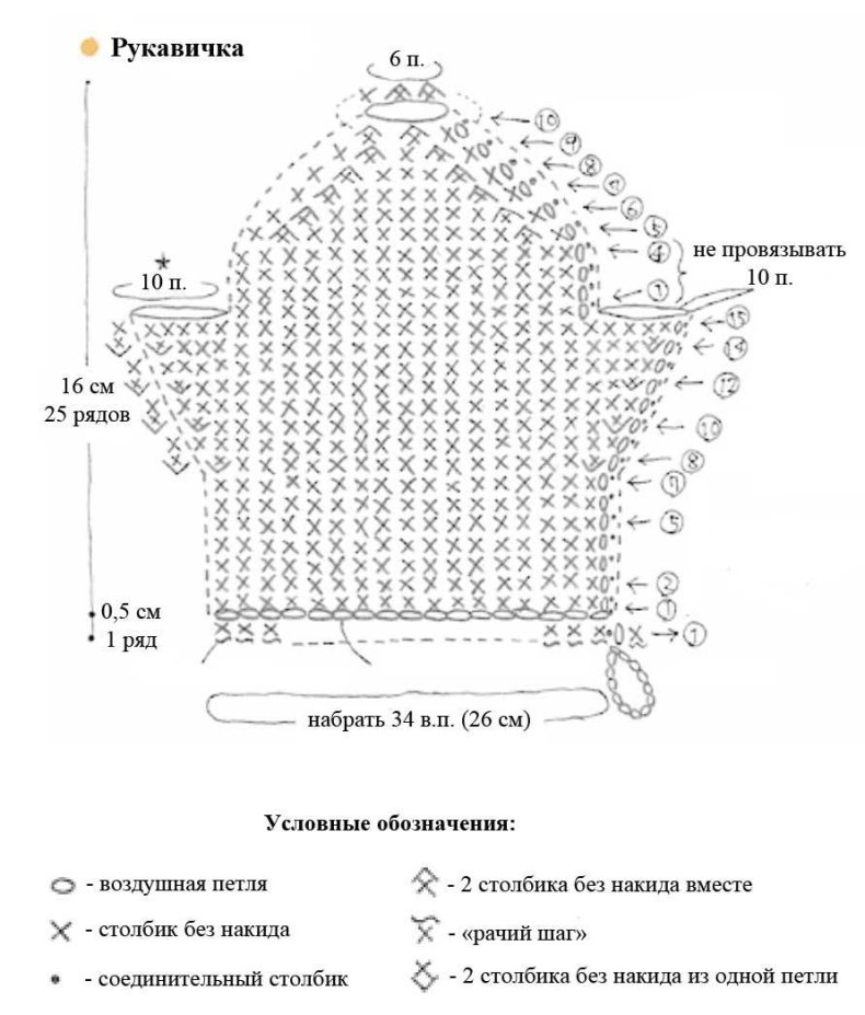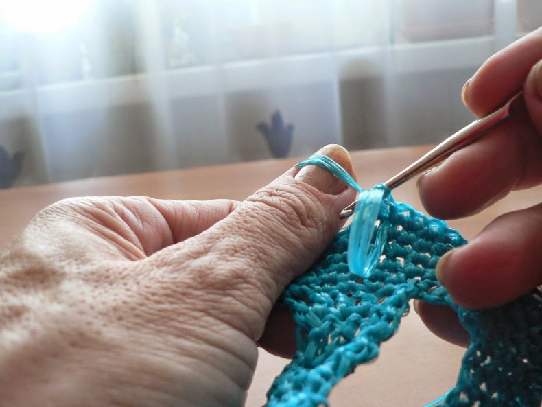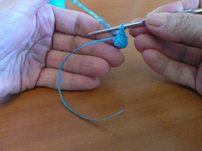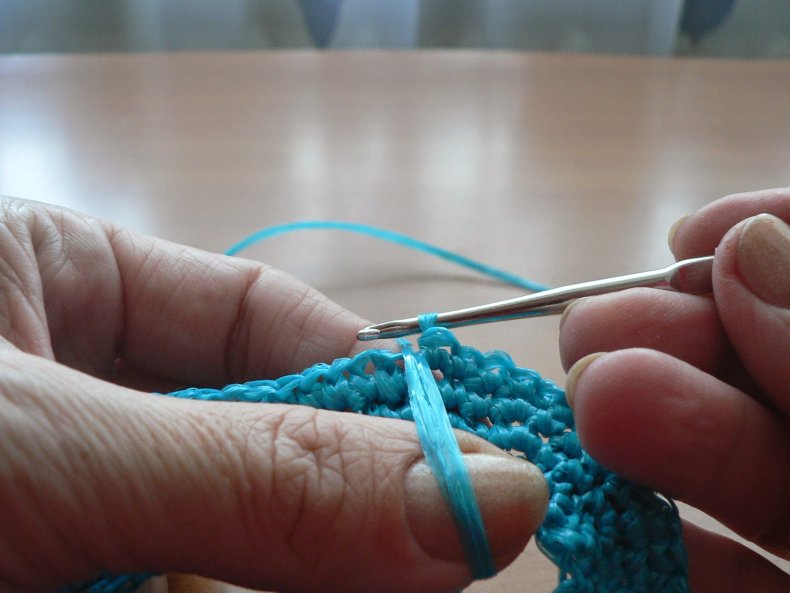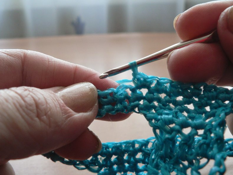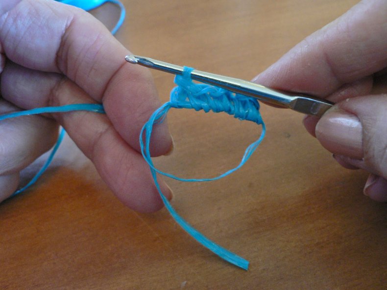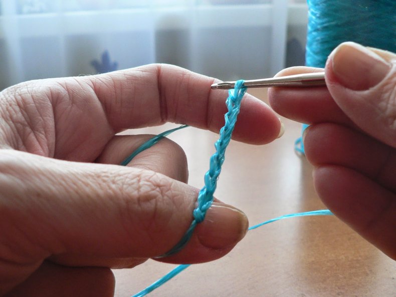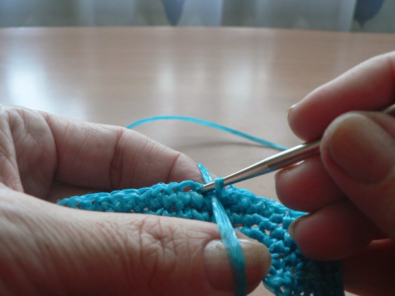- Первые 2 ряда провяжите столбиками без накидов (в технике вязания крючком этот термин обозначатся «сбн»).