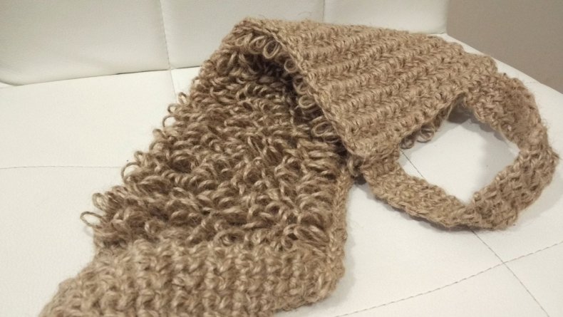 Хороший вариант для начинающих рукодельниц – плоское изделие, у которого на одной стороне петли вытянуты.