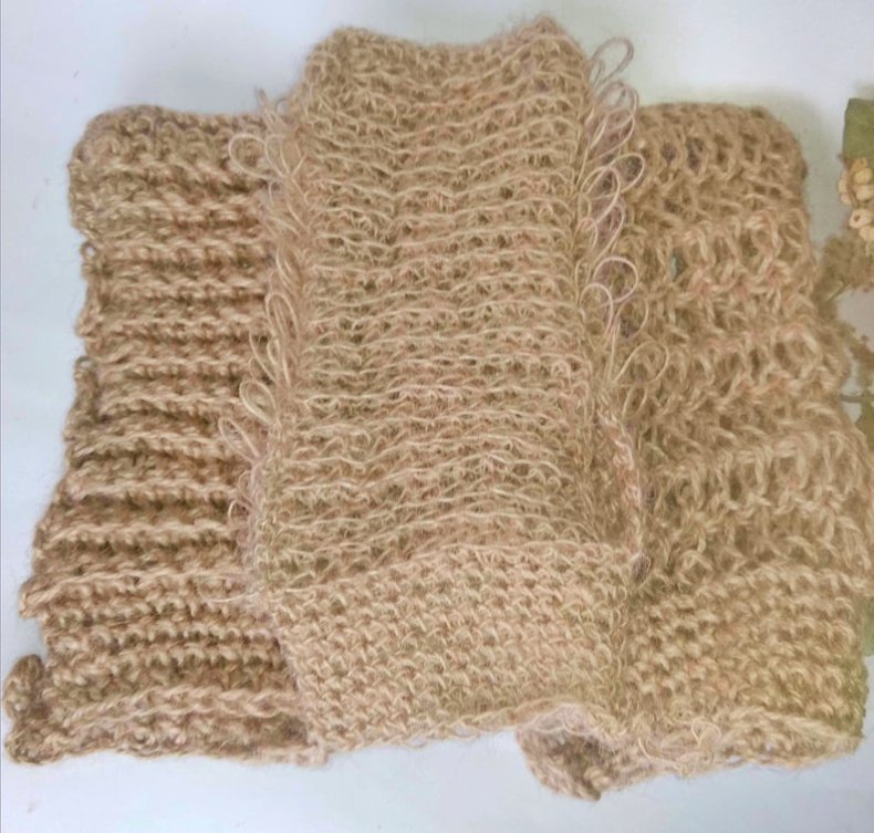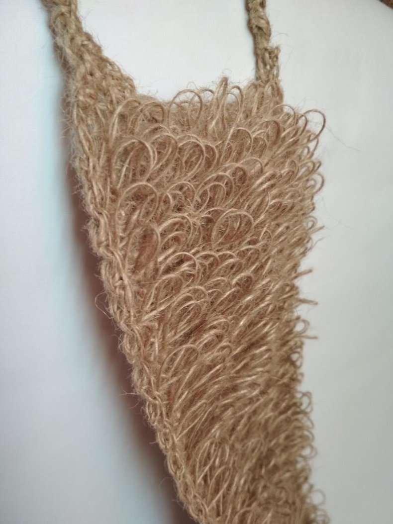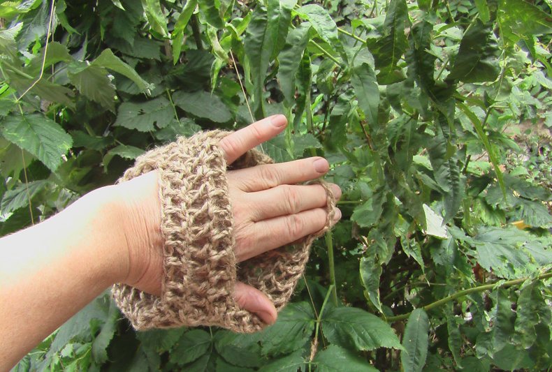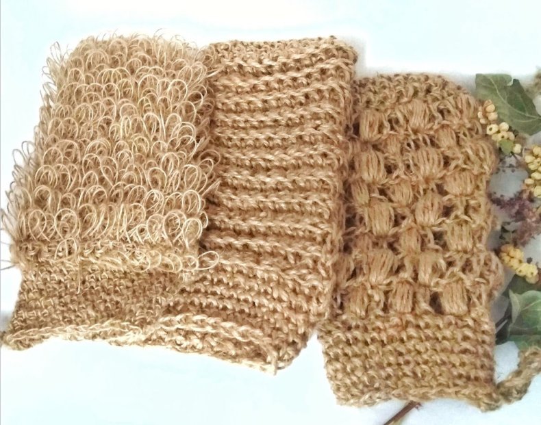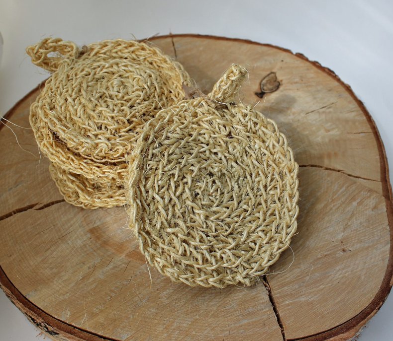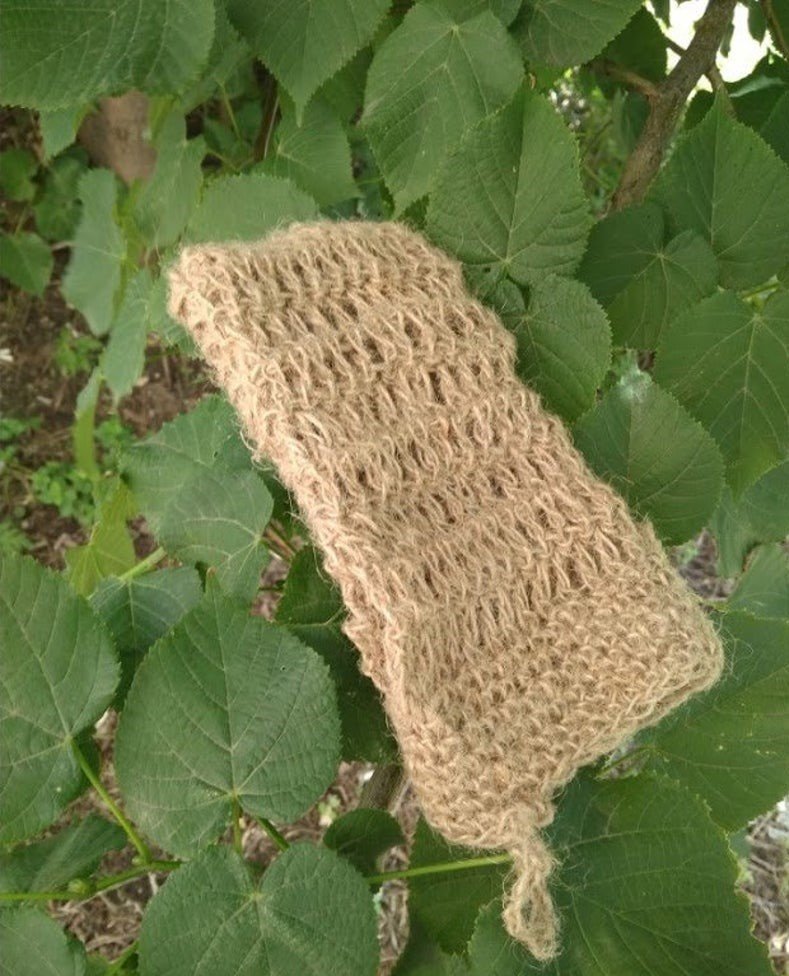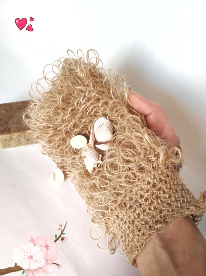 Такая пряжа производится из волокон агавы. Природный материал полезен для кожного покрова, но обладает повышенной жесткостью, поэтому пользоваться аксессуаром рекомендуется не чаще пары раз в неделю.