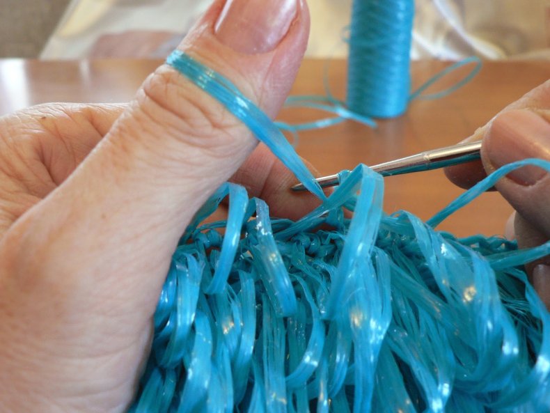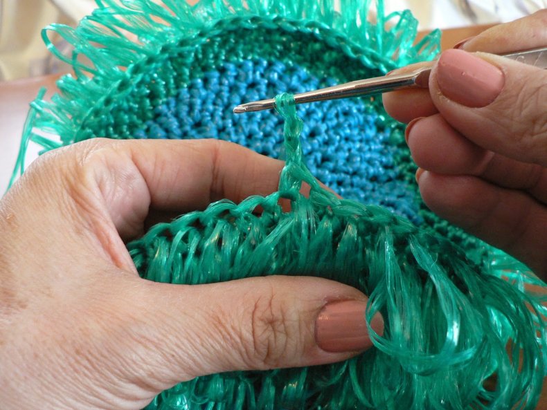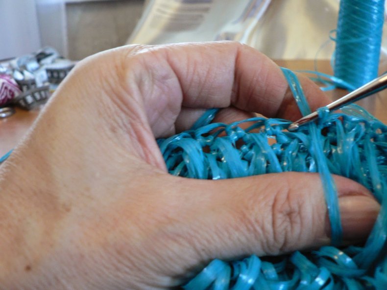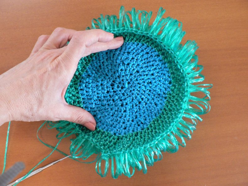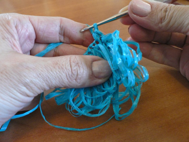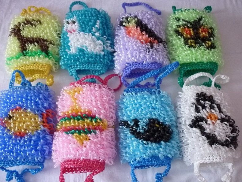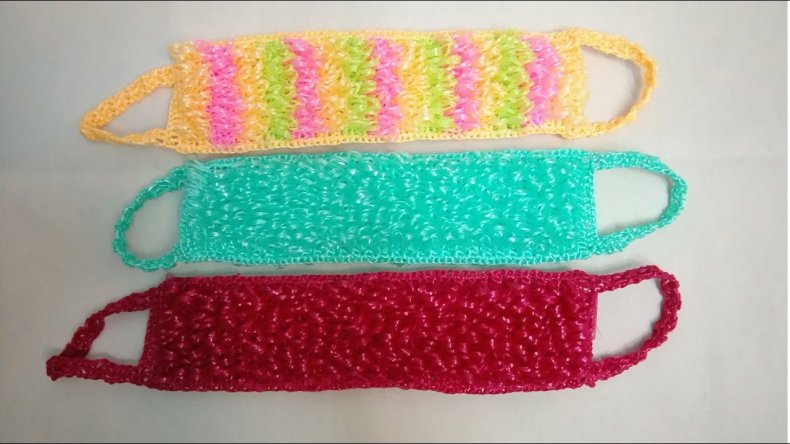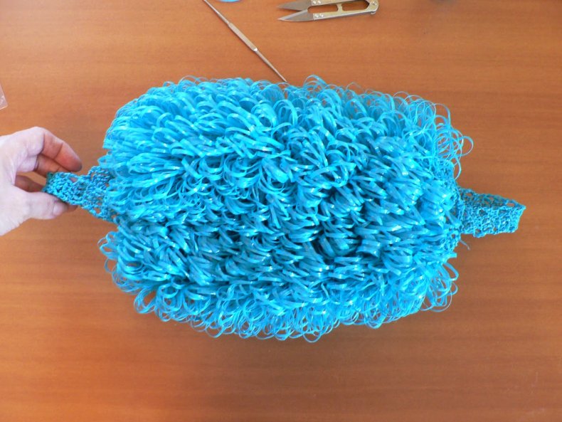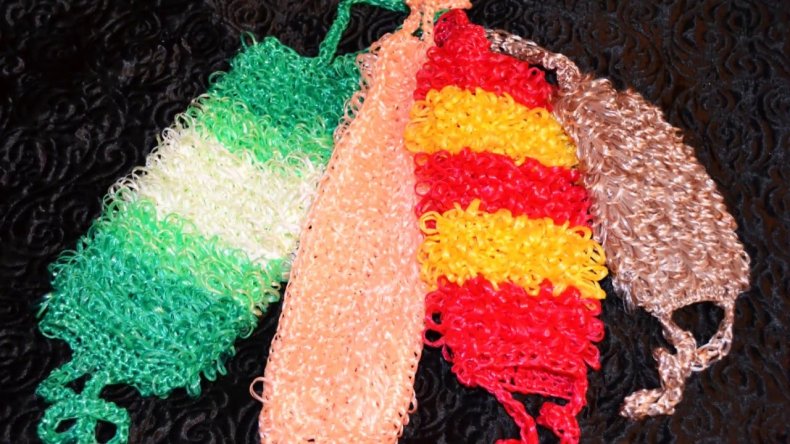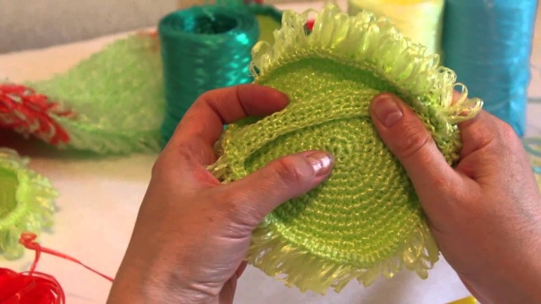 - Рукодельницы собирают их, разрезают на полоски шириной около 3-4 см и вяжут мочалки, обычно плоской формы.