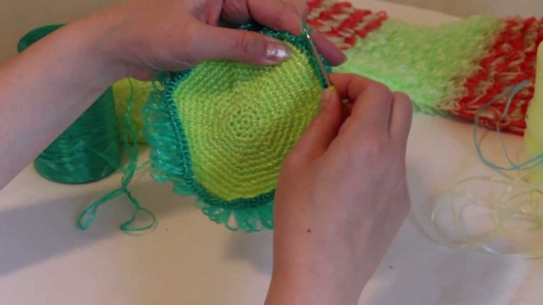 - При вывязывания 3 ряда у разноцветного аксессуара провяжите воздушную петлю обеими нитками, затем 2 сбн, а далее идет пышный столбик, который идет из первоначальной цепочки.