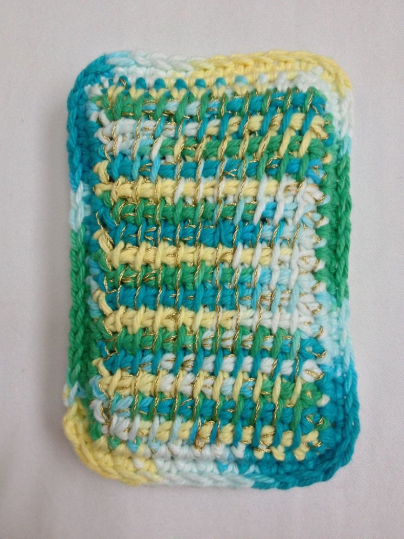 - После того как свяжете вторую сторону мочалки, сложите обе части и, либо аккуратно сшейте их, либо обвяжите крючком по краям.