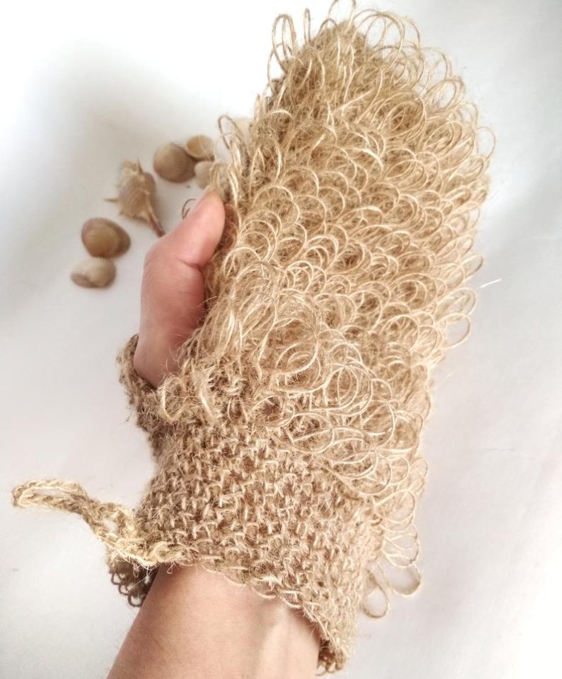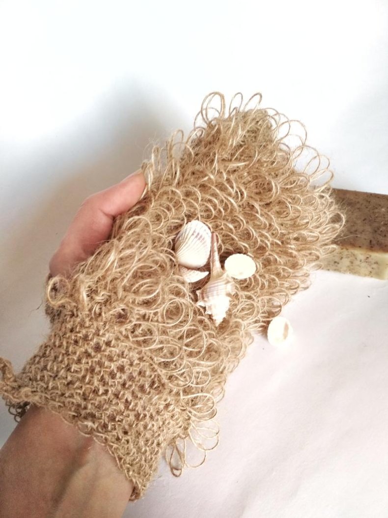 - Изделие из волокон джута – это в меру жесткий аксессуар для гигиенических процедур, который легко намыливается и отлично впитывает воду.