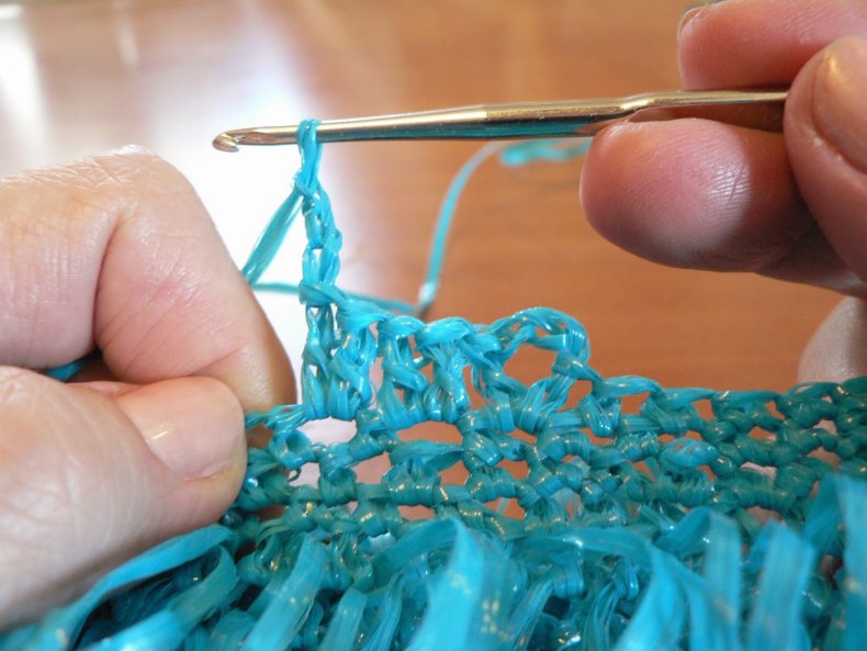 Чтобы сделать ручки, наберите примерно 40 воздушных петель (лучше в две нити). Если требуется крепче, то провяжите пару рядов, надежно закрепив их к основному полотну.