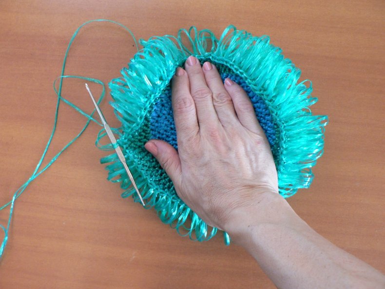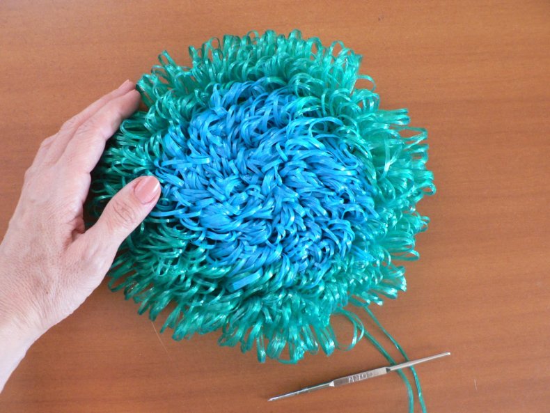 Если пряжи нет в наличии, то можно взять мешок из-под сахара или муки, хорошо постирать его, распустить на нитки и из них связать прочную и необычную мочалку.