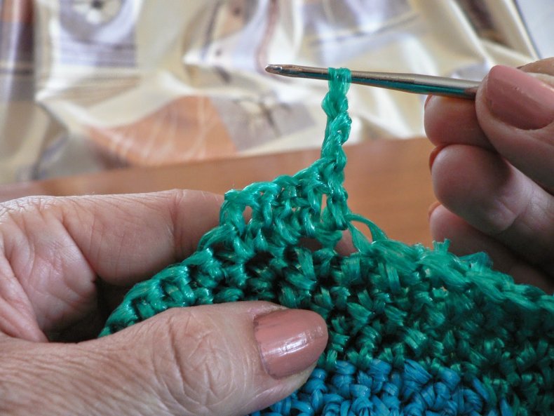 - На 4 ряду провяжите первую петлю воздушной, а в петли предыдущего ряда вывяжите сбн. У разноцветного изделия заключительная петля выполняется сразу обеими нитками.